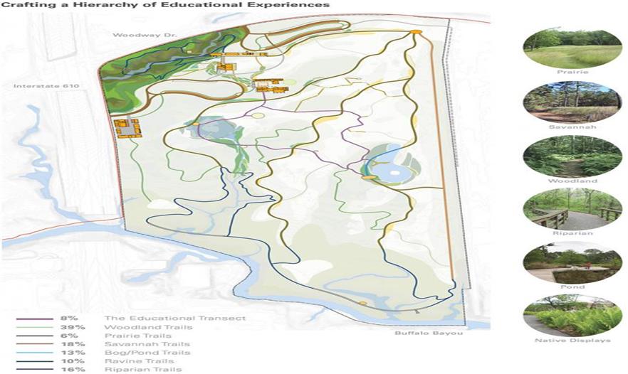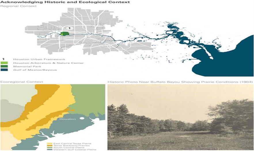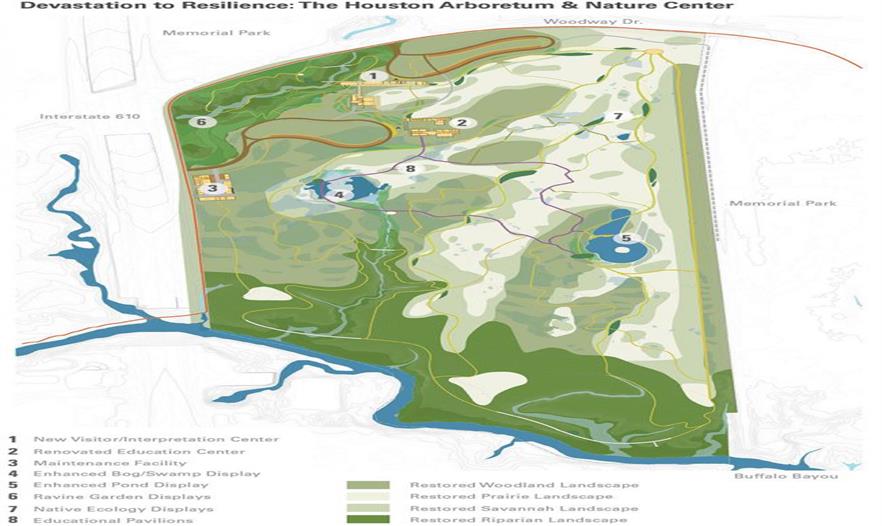 休斯頓植物園和自然中心的位置靠著水牛河(Buffalo Bayou),是一個(gè)155英畝的地區(qū)性資源,用于為原生動(dòng)植物提供庇護(hù)場(chǎng)所,同時(shí)也是城市的環(huán)境教育的一個(gè)聚點(diǎn)。這個(gè)1500英畝的紀(jì)念公園由景觀建筑和規(guī)劃公司Hare & Hare設(shè)計(jì)于1925,而植物園是這個(gè)紀(jì)念公園的一部分。自1950年代開(kāi)發(fā)以來(lái),植物園目前已經(jīng)發(fā)展成一個(gè)展示各種植物以及理想化的生態(tài)棲息地的場(chǎng)地。然而,最近的颶風(fēng)和干旱為這片景觀帶來(lái)了負(fù)面影響和損失,樹(shù)冠死亡率高達(dá)百分之四十八,而且出現(xiàn)了顯著的外來(lái)物種??傮w設(shè)計(jì)的主要挑戰(zhàn)是把基地的生態(tài)歷史和文化歷史,與現(xiàn)代化要求整合起來(lái),讓更新計(jì)劃成為一個(gè)負(fù)責(zé)任的,具有自由度的設(shè)計(jì)。