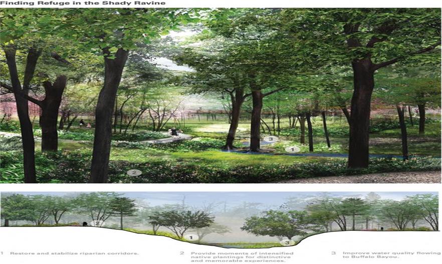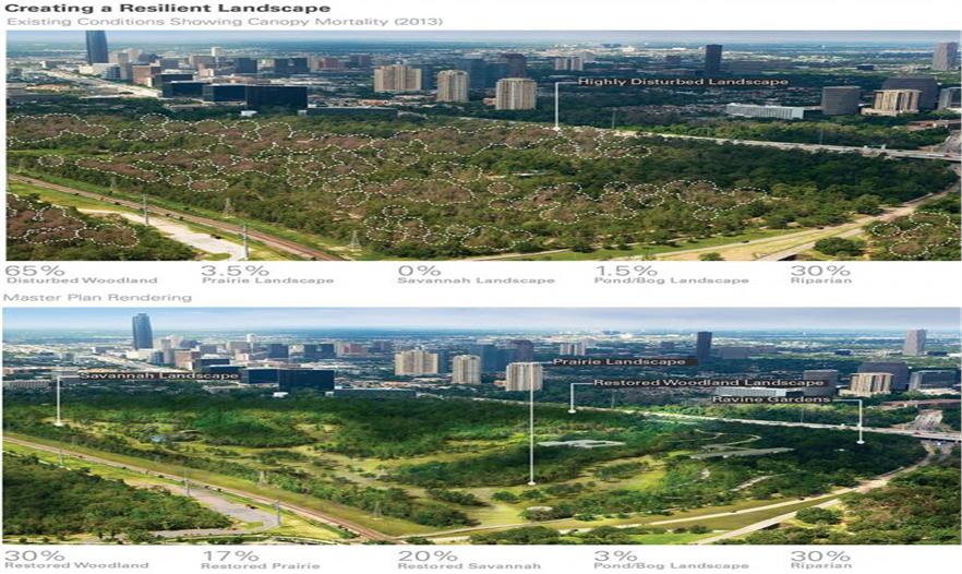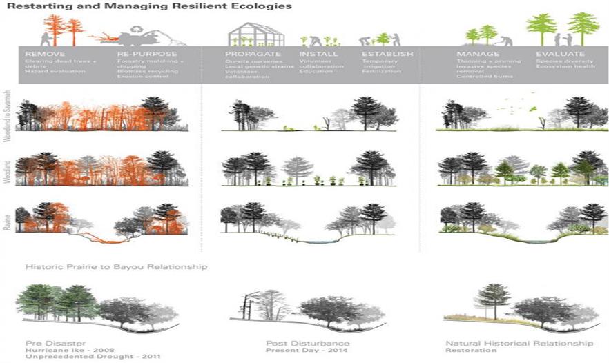 受自然災(zāi)害颶風(fēng)Ike和近期的歷史性干旱影響,植物園代表了這場(chǎng)危機(jī)中的一道風(fēng)景。所提出的設(shè)計(jì)是一個(gè)更具生態(tài)多樣性和復(fù)原性的景觀,旨在更好地應(yīng)對(duì)未來(lái)的災(zāi)害影響。