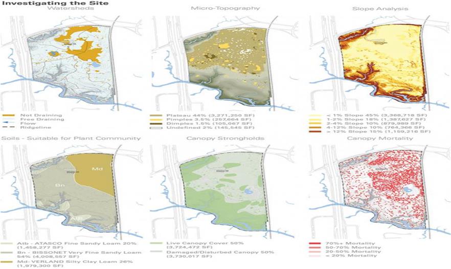 利用取證的方式,景觀設(shè)計(jì)團(tuán)隊(duì)分析了導(dǎo)致這種高度而非絕對(duì)的樹(shù)冠死亡率的場(chǎng)地具體情況。還進(jìn)行了更多的分析來(lái)了解場(chǎng)地基本情況,包括土壤類型,排水方式,樹(shù)冠,植物多樣性以及一些其他因素。由科學(xué)家和設(shè)計(jì)師組成的跨學(xué)科團(tuán)隊(duì)用GIS和現(xiàn)場(chǎng)分析進(jìn)行研究。這份分析報(bào)告發(fā)現(xiàn)樹(shù)木死亡率最高(死亡率超過(guò)百分之七十)的地方都發(fā)生在粉質(zhì)粘土,壤質(zhì)土,和“隆起-凹陷”地質(zhì)構(gòu)造特點(diǎn)突出的草原性景觀區(qū)域,這些都是為生態(tài)存在的區(qū)域。樹(shù)冠樹(shù)木生長(zhǎng)在“凹陷”地區(qū)。這些區(qū)域水容易積聚,樹(shù)木發(fā)展出較為淺和疏的根系。矛盾的是,生長(zhǎng)于升高的“隆起”區(qū)的樹(shù)冠樹(shù)木發(fā)展出較為深和密的根系,并且在干旱中存活了下來(lái)。