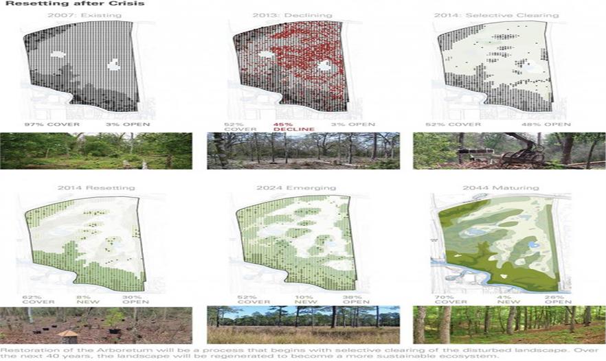 作為對(duì)生態(tài)環(huán)境危機(jī)的回應(yīng),總體設(shè)計(jì)集中于發(fā)展生態(tài)系統(tǒng)的復(fù)原能力,并且有潛力成為德克薩斯東南部以及其他持續(xù)干旱地區(qū)的一個(gè)范例。與這些系統(tǒng)的原創(chuàng)設(shè)計(jì)同等重要的是,管理機(jī)制將定期評(píng)估生態(tài)性能和對(duì)潛在威脅的應(yīng)變能力。利用一個(gè)復(fù)雜的管理矩陣和一組專門的志愿者,總體設(shè)計(jì)確定了一些戰(zhàn)略措施來(lái)啟動(dòng)新的有原動(dòng)力的生態(tài)環(huán)境。樹(shù)木的殘枝碎屑被攪碎之后從新利用來(lái)幫助新發(fā)芽的植物保持濕潤(rùn),并且為因?yàn)楦珊刀嘶耐寥乐匦绿峁┲匾挠袡C(jī)物質(zhì)。入侵物種的灌木叢將被移除,強(qiáng)化了樹(shù)冠樹(shù)木的據(jù)點(diǎn)和其他的本地植物。志愿者將在波浪中種植漂浮的新芽植物。將會(huì)種植大片的草原和熱帶草地,并且每年會(huì)進(jìn)行切割或者控制性焚燒來(lái)進(jìn)行再生。管理戰(zhàn)略的朝著一個(gè)有復(fù)原能力的,不斷動(dòng)態(tài)進(jìn)化的系統(tǒng)發(fā)展,滿足了植物園的使命,也就是把土地理解為自然棲息地和相關(guān)系統(tǒng)的集合,而不是樹(shù)木的簡(jiǎn)單集合。