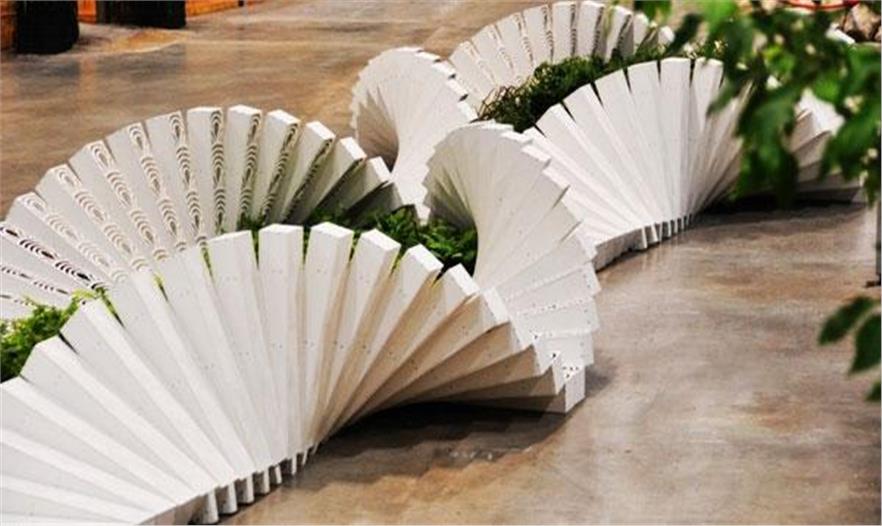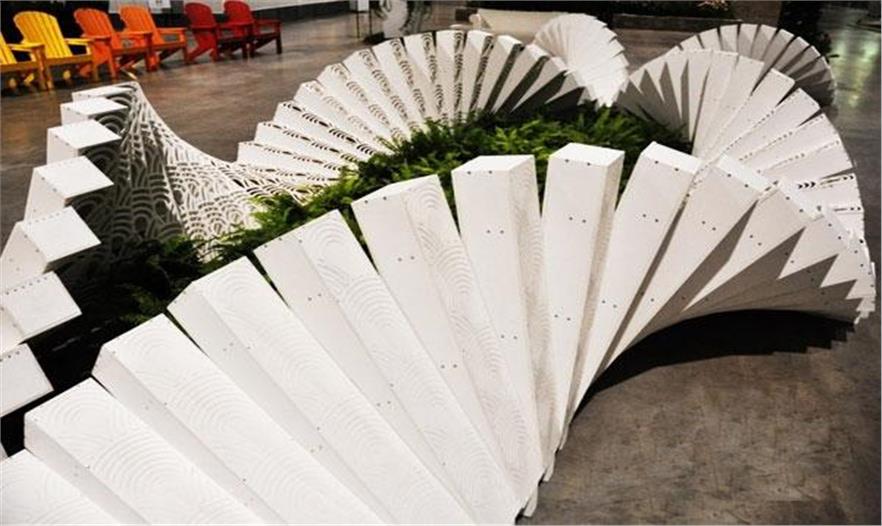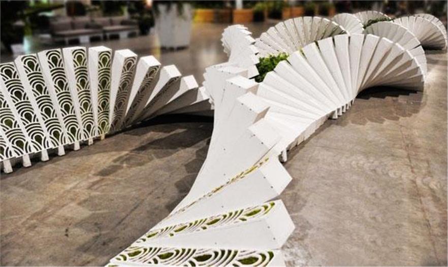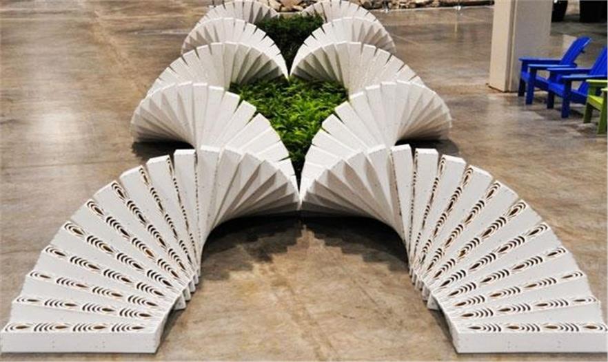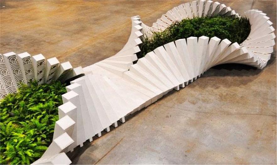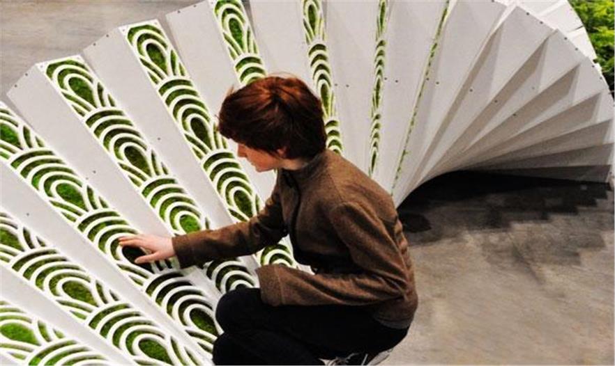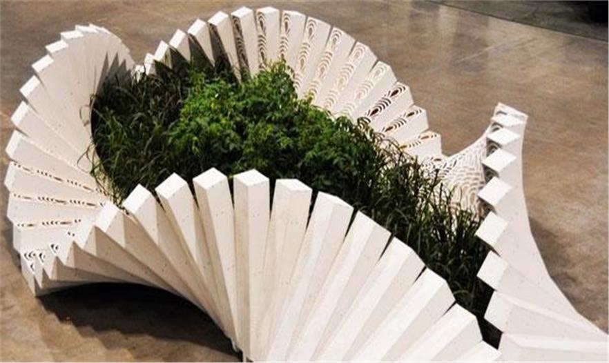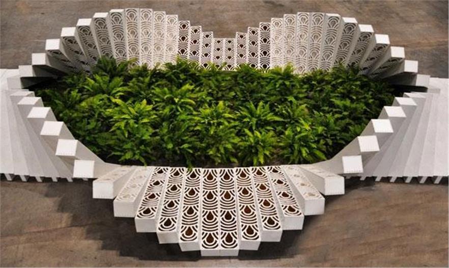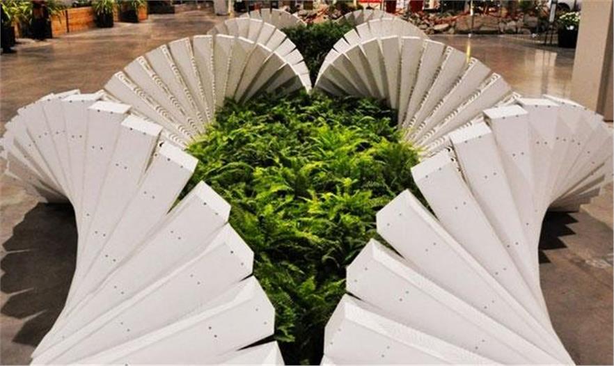 花園開放式的外觀使其功能變得非常強(qiáng)大,它可以用來保護(hù)花盆空間,使苔蘚朝向不同的方位開放,同時又形成了扭曲的波浪形外觀,使花園的結(jié)構(gòu)非常穩(wěn)固。作為一個整體,該設(shè)施的表面可以朝向不同角度開放,互成角度,美感十足,從而為在苔蘚表面呈現(xiàn)出不同的微型氣候。因此,設(shè)計師可以根據(jù)植物種類的不同分布,基于微型氣候的細(xì)微差別合理的種植植物。