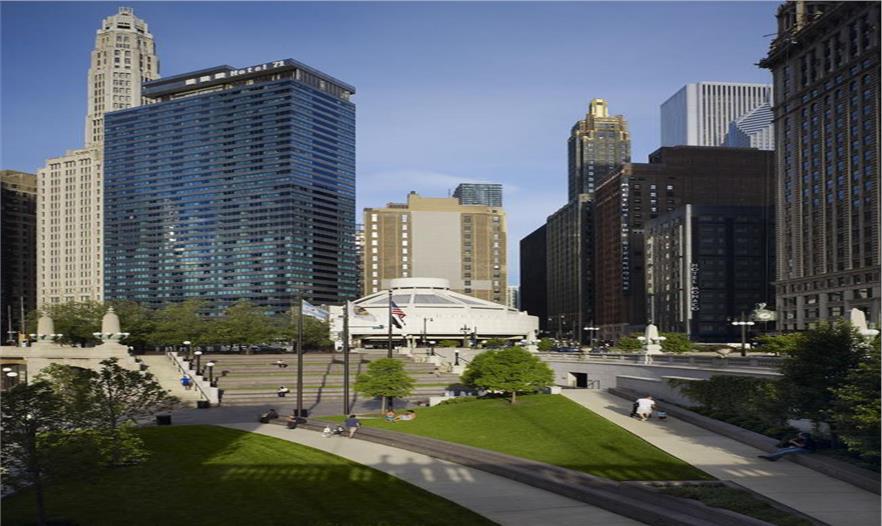 景觀美化后的區(qū)域和草坪均衡了石灰?guī)r和大理石柱、壁柱以及檐口設(shè)計(jì),這些是原來(lái)Wacker Drive街兩旁的延伸物。