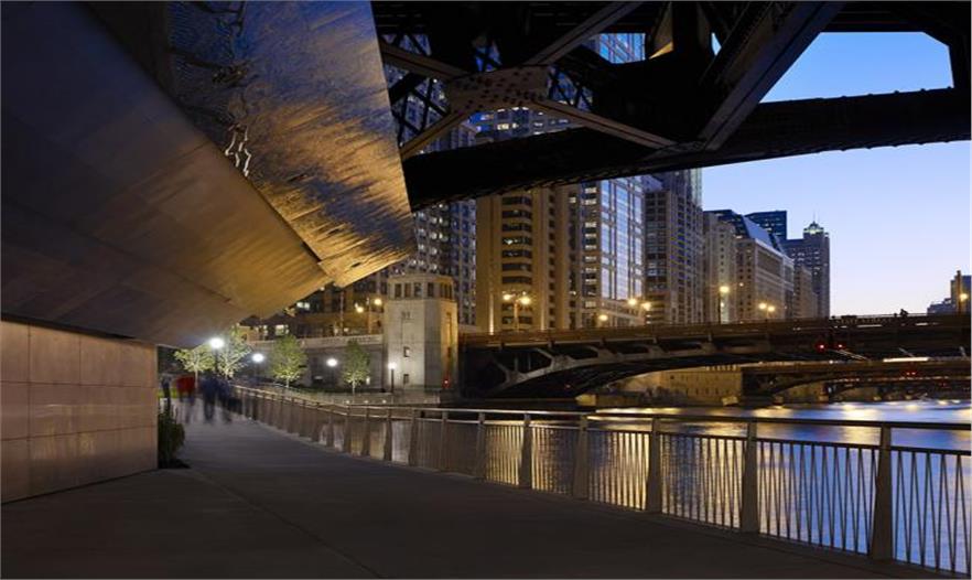 新的芝加哥河畔步道是沿Wacker Drive下街區(qū)河流水位的一項(xiàng)主公共設(shè)施,從密歇根大道西延伸到湖街,它既是營(yíng)業(yè)場(chǎng)所,又是公共活動(dòng)場(chǎng)地。步道與城市的過(guò)去顯然有著象征性聯(lián)系,同時(shí)還為公民、參觀者和穿過(guò)芝加哥城的這條河流的追隨者創(chuàng)造了最先進(jìn)的設(shè)施。