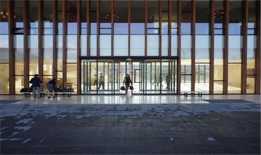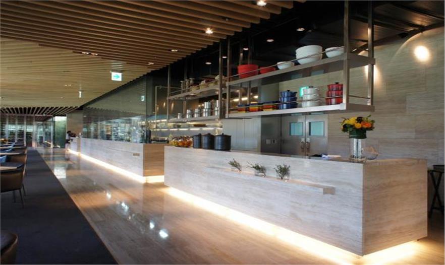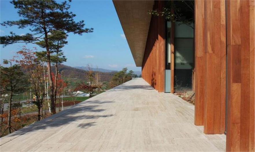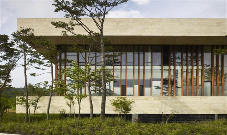 這個細(xì)長的白色建筑就像一個漂浮的觀景樓,位于兩個平行的白色石灰板之間,大型的玻璃和木質(zhì)結(jié)構(gòu)立面能讓游客觀賞到高爾夫場地的景象以及周圍的自然景觀。