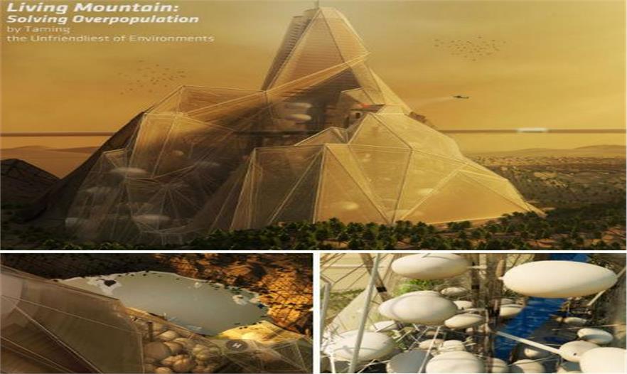 這座“居住山”是為了讓人們避免由于全球變暖帶來的土地沙漠化危害而設(shè)計的,這一概念模型設(shè)計是來自Evolo摩天樓設(shè)計大賽的作品。根據(jù)設(shè)計,它將為世界上環(huán)境最惡劣地區(qū)之一——中國西北部的塔克拉瑪干沙漠——提供一個可居住的沙漠綠洲。在這座人造山形建筑中,可以創(chuàng)造自己的微氣候環(huán)境。這一超級建筑包括許多2000平方英尺的“居住倉”、通過提取地下水和收集雨水形成的人造湖。這些重疊的山脈建筑通過纜車進(jìn)行交通聯(lián)絡(luò)。