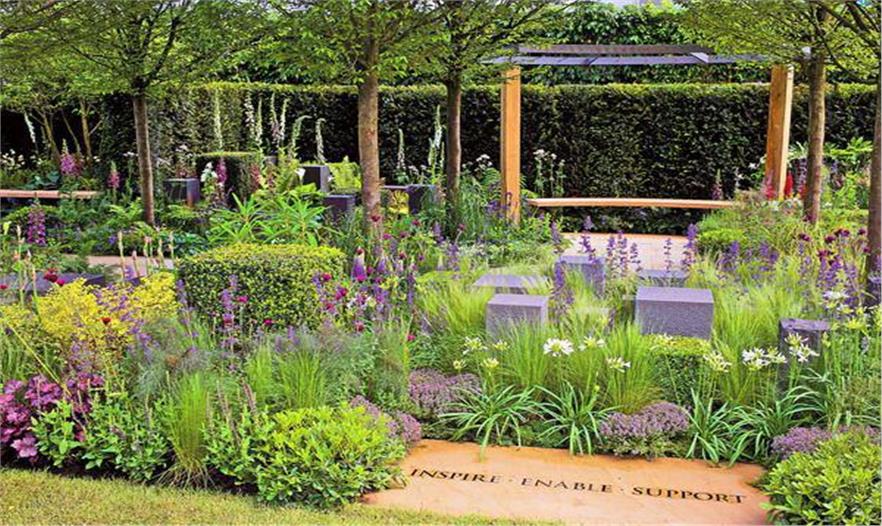 傷員慈善會(huì)“幫助英雄”贊助了地平線上的希望花園,象征著那些傷病員走向康復(fù)所要經(jīng)歷的復(fù)雜道路。慈善會(huì)的理念是在那些英雄的康復(fù)過程中鼓勵(lì)并支持著他們,協(xié)助他們從傷害和痛苦中汲取力量,加強(qiáng)對(duì)未來的希望與自信?;◢弾r代表著他們的體格,而植物則代表著他們的精神。花園起初十分粗糙、未經(jīng)修飾、雜草叢生,后來被逐漸整修一新,井井有條。園中到處都是寧靜的冷色調(diào),有助于鞏固靜謐的沉思氛圍,為士兵們?cè)O(shè)計(jì)一個(gè)有利于身心恢復(fù)的空間。