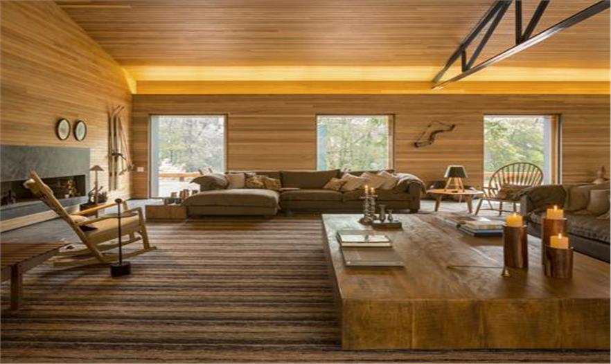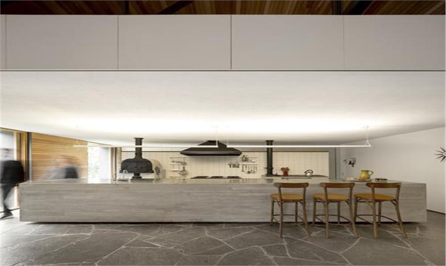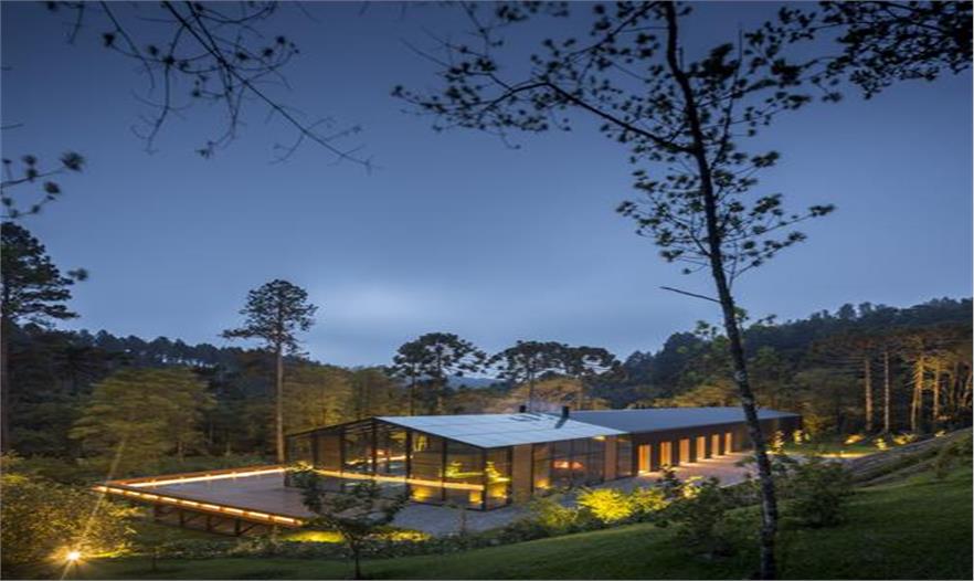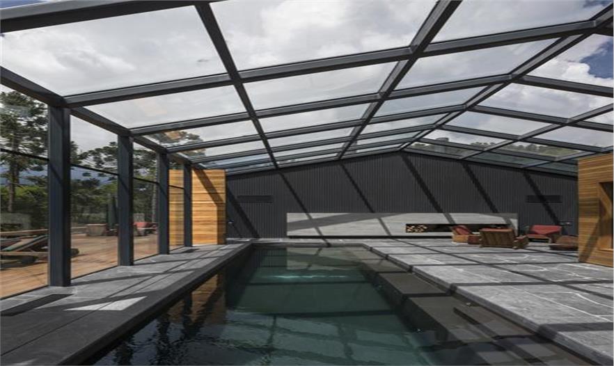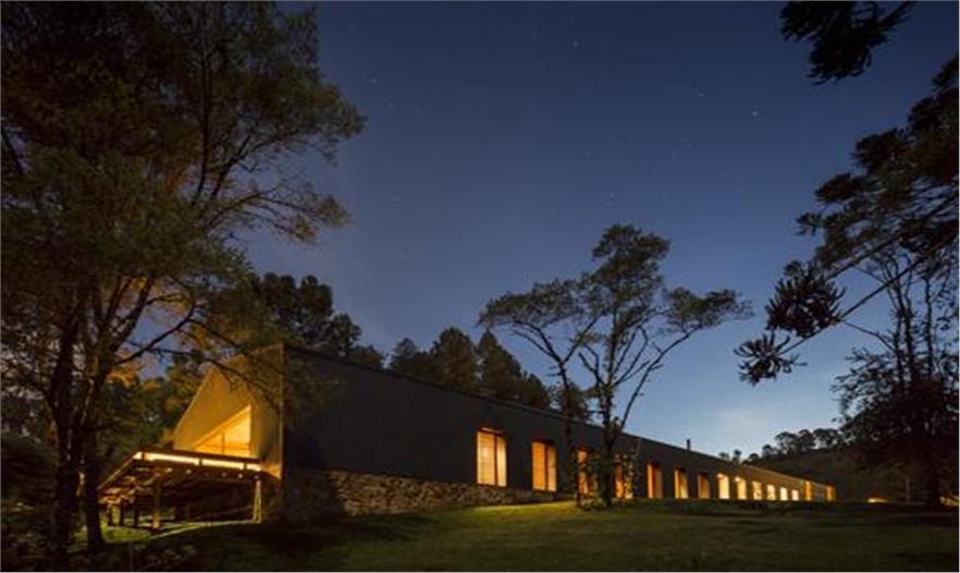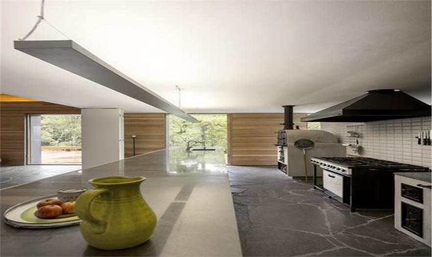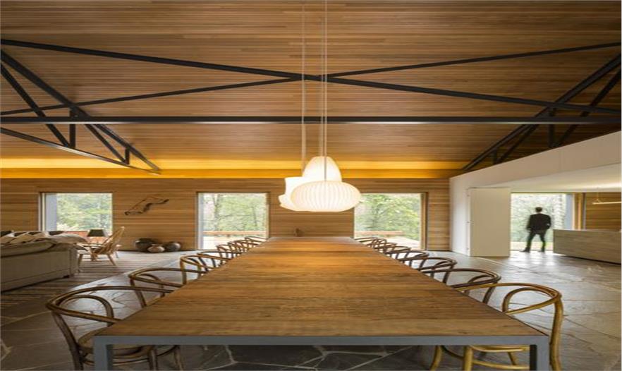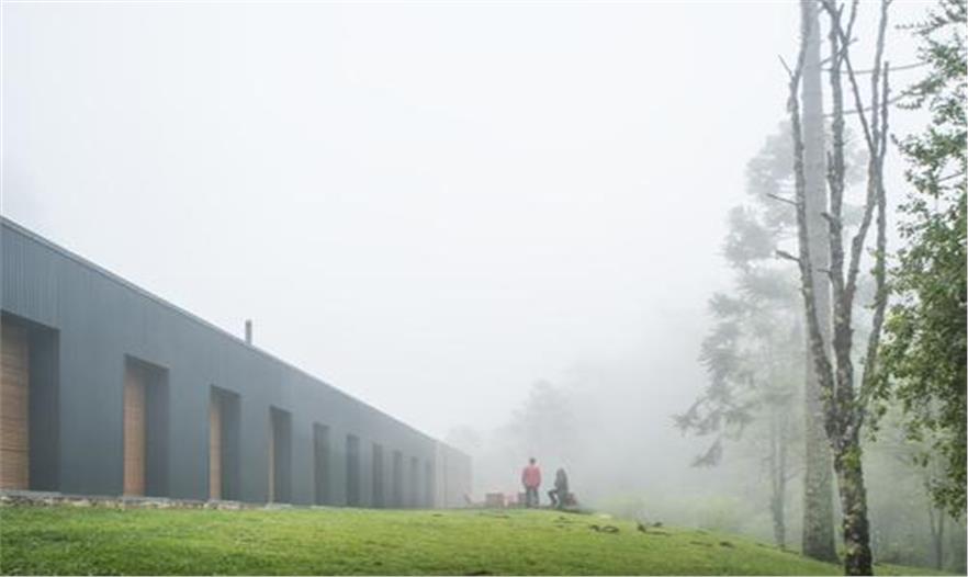 從外形上看,連續(xù)的相同空間在一個不透明的立面體(起居室所在地)與延伸的熱水池和桑拿室透明區(qū)域中重疊了。該別墅的容量是根據(jù)一個鐵屋65米的突出部分進行測量的,還是人字形的屋頂。此外,室外的一個木制甲板將這些空間連接起來,建造了一個日光浴場,供人們夏季使用。在這個建筑長50米的不透明空間里,開口得到了最小化,用作滑行門來加強室內(nèi)與室外的融合。建筑立面中空與滿的關(guān)系產(chǎn)生了熱力性能,存有大量的電能。透明部分的延伸區(qū)有14米長,而且只部分設(shè)計了內(nèi)部通風(fēng),避免由于高溫玻璃凝結(jié)的情況,影響周圍的景色。這座別墅不會建在原始區(qū)域的頂端,正如客戶開始期望的那樣,而是建在該區(qū)域最低的部分——一片漂亮的松樹林之間。這個設(shè)計方案讓這座房屋充滿了自然氣息,營造出與該區(qū)域之間的密切聯(lián)系。該項目的原始設(shè)想是去設(shè)計一個快捷且廉價的房屋。所以,在這里會發(fā)現(xiàn)工業(yè)化的設(shè)計方案,例如鋼鐵結(jié)構(gòu)和鐵架墻。這個區(qū)域除了雨水量大之外,一直是清爽的。