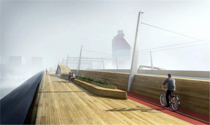 這座橋的上方主要包括軟材料和植被。人行區(qū)域被設(shè)計(jì)成一個(gè)木制景觀,有長(zhǎng)凳、氣象防護(hù)和垂直的連接點(diǎn)。其目的是這座橋能讓游客有一個(gè)積極、豐富和安全的體驗(yàn)經(jīng)歷,從一段距離、橋下和橋上充分地體驗(yàn)這座橋。