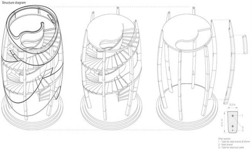 預制支柱結構是承重部件,運送過來后再用鋼絞線加固,之后它們被豎立在建筑場地上,基底和上部位置都被固定。(見:結構圖和模型圖片)。