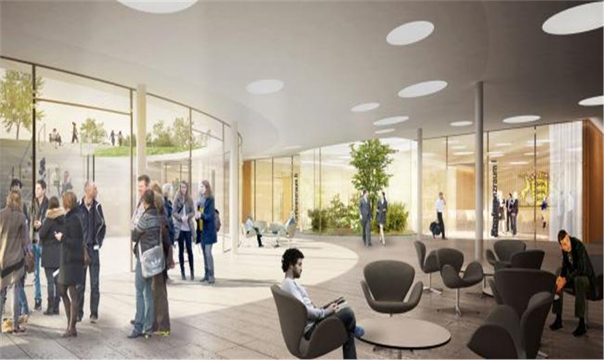 這個新中心包括一個大廳、會議空間和一個展覽區(qū),視覺上是與外面的廣場相連接。
