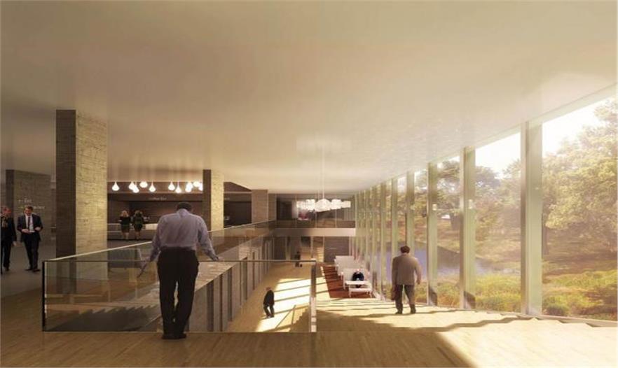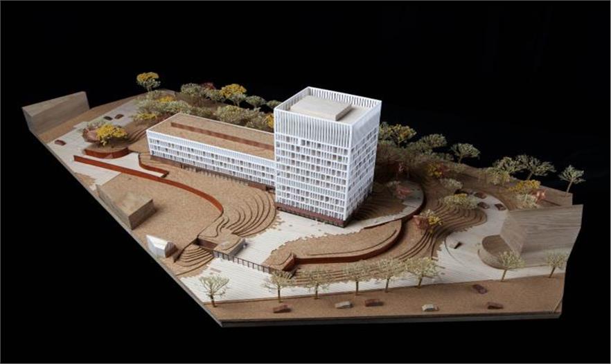 這個(gè)建筑包括一個(gè)簡(jiǎn)潔的塔樓和一個(gè)較低的建筑。裝有會(huì)議設(shè)施的兩個(gè)地下室層與起伏的沙丘景觀相鄰。這些沙丘不僅接收日光,還提供了綠色景觀。這個(gè)景觀設(shè)計(jì)以自然形式滿足了嚴(yán)格的安全需求,其中這些沙丘阻礙了看到地下室的直接視線,水池構(gòu)成了安全屏障。