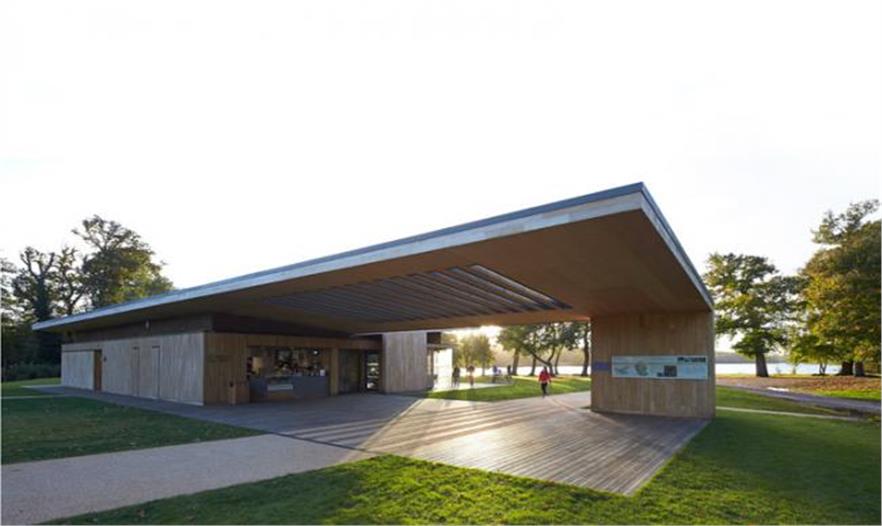 這個新建筑俯瞰Virginia Water,它是一條人工湖,處于18世紀(jì)如畫般的景觀當(dāng)中,坐落于溫莎大公園西南角的國家一級皇家景觀內(nèi)。這個新游客中心的概念來源于眼前的景觀。這座建筑位于公共入口,歡迎游客前來Virginia Water游玩。其遮蓬結(jié)構(gòu)與這個湖的景色相融合,并給予人們抵達(dá)感和期待感。這座建筑的梯形結(jié)構(gòu)和其陽臺俯瞰著這條湖,提供了一個賣甜點(diǎn)的空間、廁所和員工設(shè)施?,F(xiàn)存樹木再加上新栽植物構(gòu)成了“樹木繁茂的林間空地”,作為這個建筑的背景環(huán)境。這個新涼亭是由溫莎地產(chǎn)經(jīng)濟(jì)林的可持續(xù)性木材建造的,輕輕地坐落在這個景觀上。