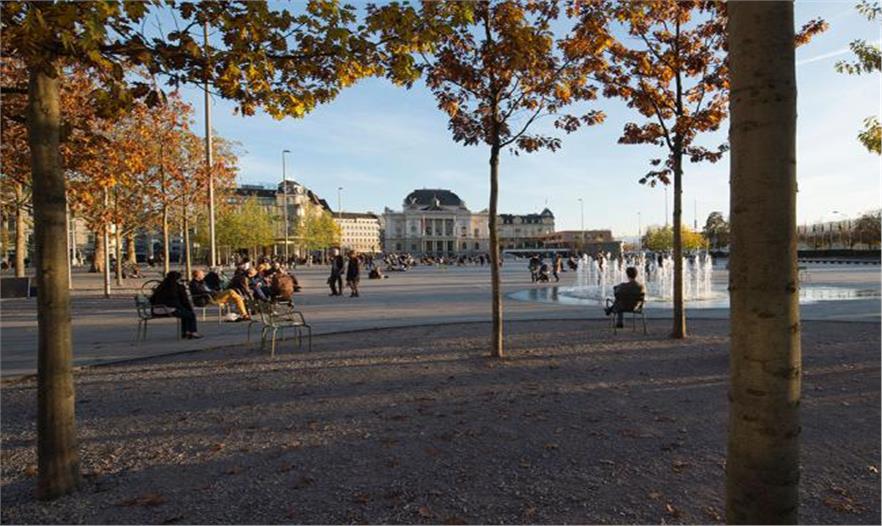 Sechseläuten廣場(chǎng)是“歌劇院、歌劇院停車(chē)場(chǎng)和Sechseläuten廣場(chǎng)”項(xiàng)目的一部分,這整個(gè)項(xiàng)的目的在于增加貝爾維尤和歌劇院之間的公共空間。把之前的Sechseläuten區(qū)轉(zhuǎn)變成Sechseläuten廣場(chǎng)是用一個(gè)地下停車(chē)場(chǎng)替代歌劇院前面停車(chē)場(chǎng)的政治決策。這個(gè)項(xiàng)目“opus one”是一個(gè)三級(jí)的國(guó)際競(jìng)賽獲勝者的作品。由于所提議的理念,蘇黎世歌劇院獲得了廣場(chǎng)上的一個(gè)顯著位置。一個(gè)新的具有代表性的廣場(chǎng)誕生,也成為了歌劇院的一個(gè)廣闊的舞臺(tái)。Sechseläuten廣場(chǎng)包括天然石頭鋪設(shè)的地面;它適合多種應(yīng)用和發(fā)展的可能,而且會(huì)主要供公眾使用。不同面積和密度的一片片樹(shù)木就像一個(gè)舞動(dòng)的芭蕾舞演員。對(duì)比廣場(chǎng)的寬闊,種植的樹(shù)木為行人提供了一個(gè)受保護(hù)和蔭涼的休息區(qū),還有供行人休息的可移動(dòng)椅子。