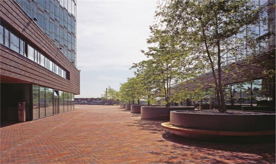 《明鏡周刊》的新建筑和Ericus Kontor建筑面向水和一個南向的廣場而建。一個突出的主題是平滑的水面,與地表齊平,映射出燈光、天空、人、樹和外形結構,與此同時從現(xiàn)有的開放空間里分離出餐飲區(qū)。寬闊、南向的階梯可用于座位,也可以沿著臺階向上走,就像個地毯一樣,其細節(jié)元素也突出了實體性和疊印主題。同時,帶有座位裝置的這些階梯精密程度很高,提供了改變寬闊走廊沿線高度的好機會。
