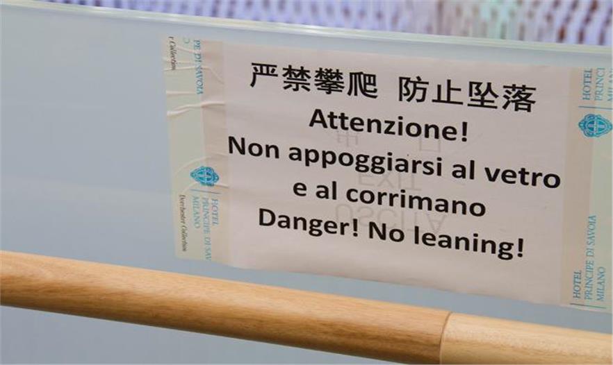 更過分的是這個,和剛才希望的田野是兩個貼在一起的。字體,語言順序和剛才那個都不一樣,你讓強迫癥,處女座怎么辦??!先不說貼這個有沒有必要,你都做了欄桿了,還要貼這個就是多此一舉。就算貼了也要找一個低調一點的透明膠吧,為什么要用XXhotel的透明膠去貼這個A4紙呢?。∥掖笾腥A的逼格呢!