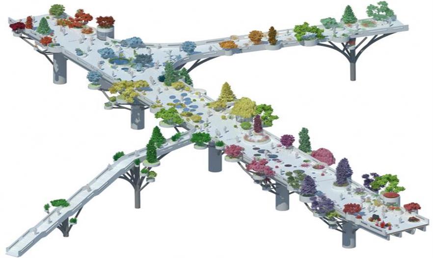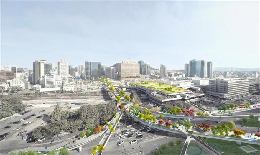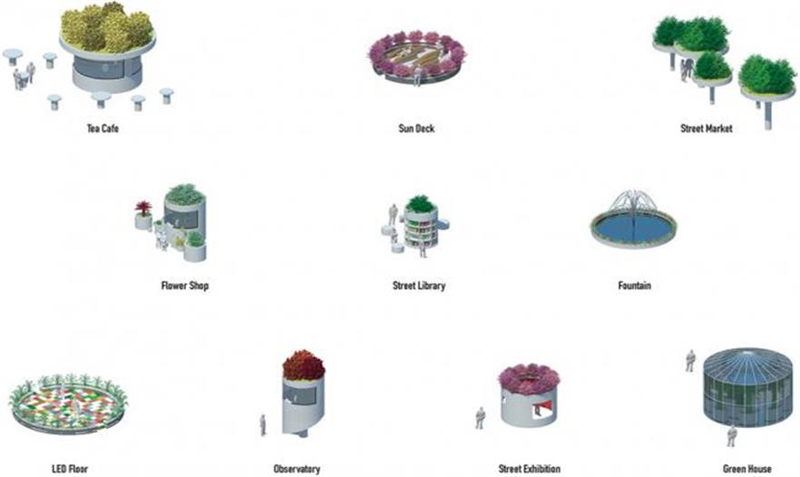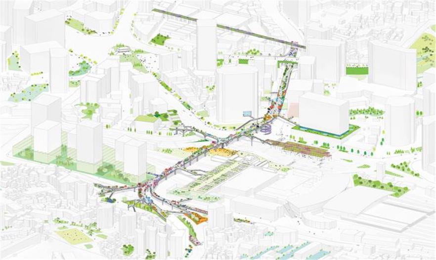 MVRDV將首爾本土植物與圓形花盆結(jié)合,打造出一個獨特的綠色空間;再將一系列城市公共空間活化劑要素比如茶餐廳,花店,自由市場,圖書館等植入其中,力求讓場所變得更有生機與可能性。與此同時,這座美麗的天橋在蔓延的過程中還衍生出系列分支,與周邊的綠地和公共空間相聯(lián)系,極大的帶動周邊城市活力與豐富性。