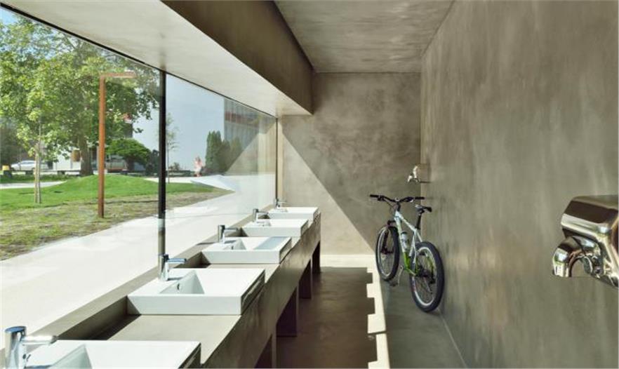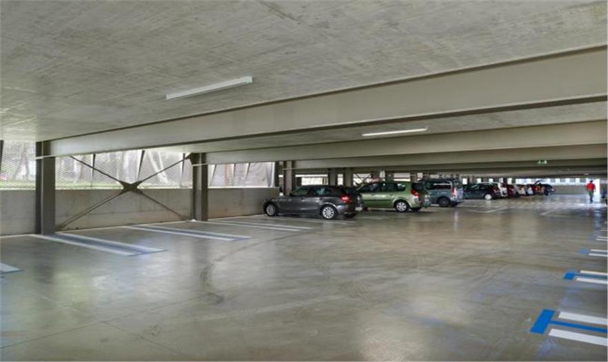 這個(gè)停車場(chǎng)的結(jié)構(gòu)與周圍的景觀相一致。地表區(qū)域上輕微延伸的設(shè)計(jì)體現(xiàn)出這個(gè)建筑的位置,被保存完整的樹(shù)木環(huán)繞著。這個(gè)建筑的前立面是一個(gè)非常受限制的設(shè)計(jì),參照了臨近的其他建筑的簡(jiǎn)單結(jié)構(gòu)。