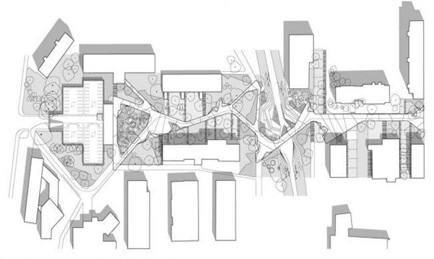 像該城鎮(zhèn)中心的其他停車場(chǎng)一樣,社區(qū)健康中心前面的這個(gè)停車場(chǎng)因?yàn)槿萘坎蛔?,打算擴(kuò)展到周圍的綠色區(qū)域。設(shè)計(jì)師并沒(méi)有擴(kuò)大地表面積,而是選擇部分深挖和覆蓋這個(gè)停車場(chǎng)