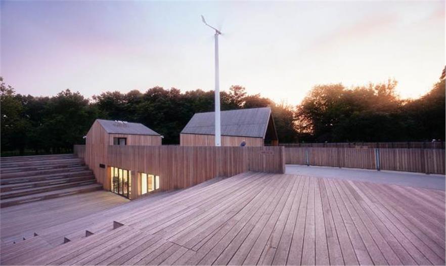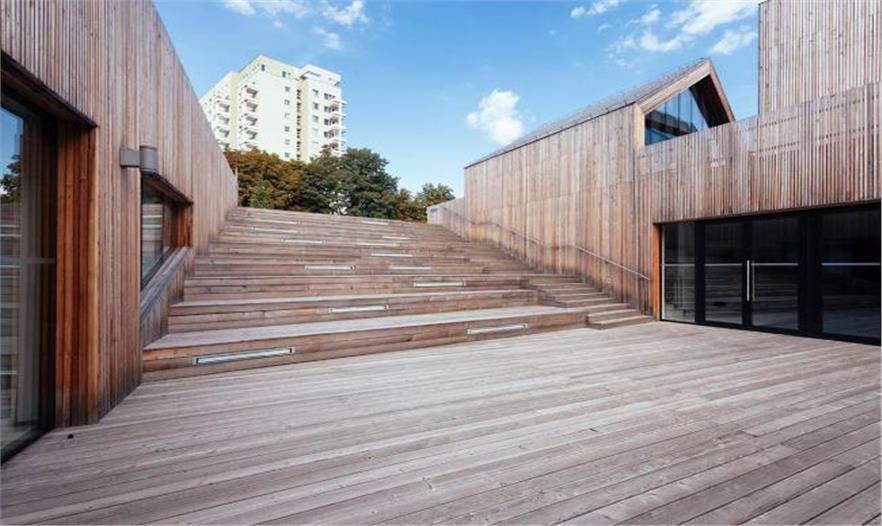 這個(gè)下沉的區(qū)域?yàn)閼騽”硌?、露天表演提供了舞臺(tái)。其暖色的木制地板歡迎人們?cè)诖诵菹⒑蛥⑴c各種活動(dòng)。同時(shí),它也很容易地被拆掉,維護(hù)下面穿過的雨水收集器。