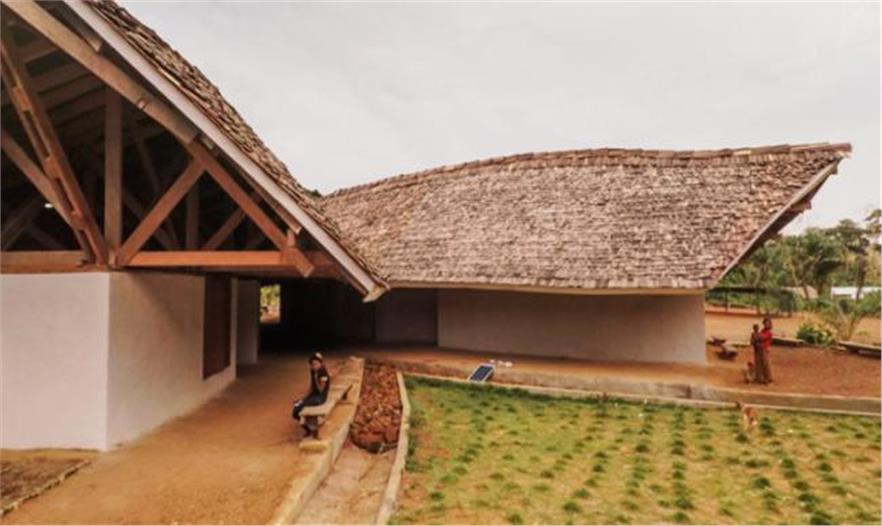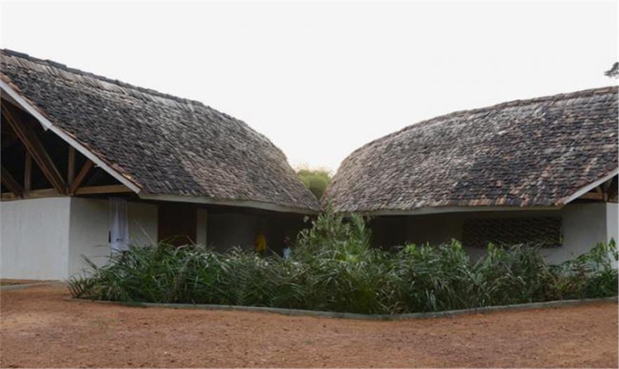 由于當?shù)馗邷囟嘤甑臒釒в炅謿夂?,室?nèi)的墻體高度只達到屋頂高度的三分之二,留出頂部空間使空氣流通。屋頂?shù)某鎏艚Y(jié)構(gòu)比較夸張,為烈日和暴雨提供了額外的遮蔽處。此外,匯水槽收集的雨水可以用來進行農(nóng)業(yè)灌溉。