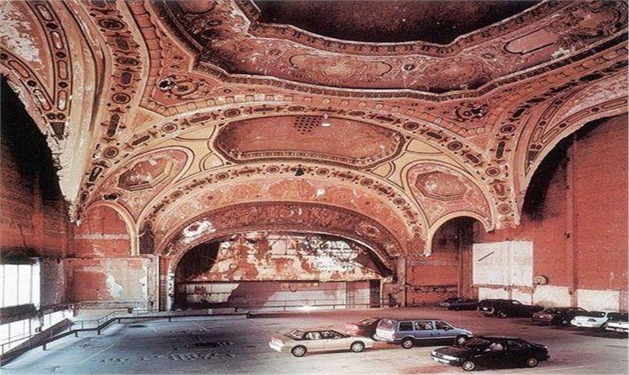 底特律政府曾想過把整個(gè)劇院拆除,但因?yàn)闀?huì)危及相鄰的辦公大樓,所以放棄。現(xiàn)在的它已經(jīng)成為一個(gè)三層樓的停車場(chǎng)。身處其中,你會(huì)發(fā)現(xiàn)這個(gè)停車場(chǎng)是一個(gè)完整的圓形空間,可以看見過去的輝煌:宏偉的樓梯,連接陽臺(tái)的紅地毯、紅色天鵝絨窗簾以及墻上壯麗的壁畫。