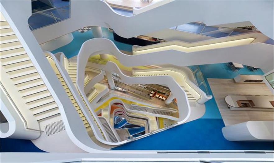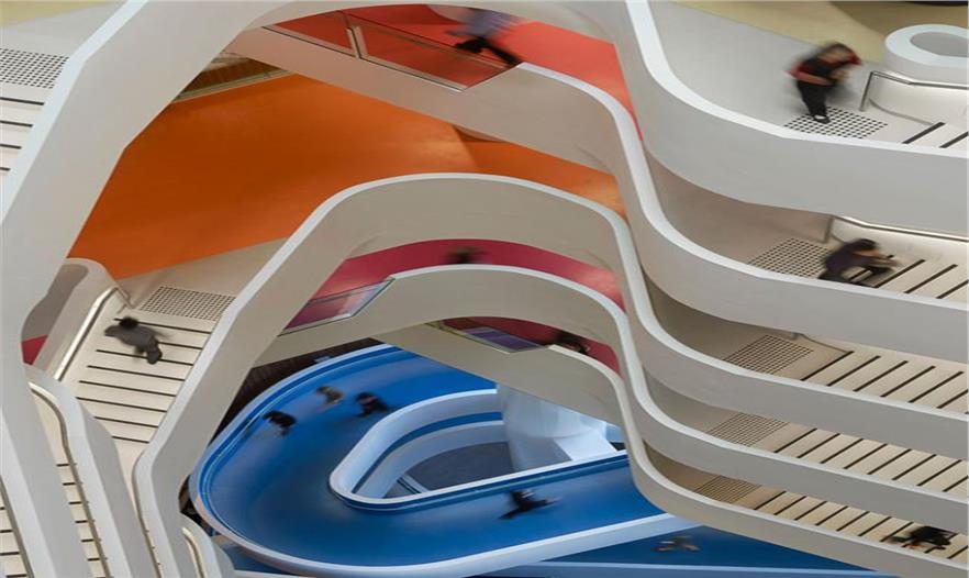 我們看到的滿眼的錯綜復雜的樓梯從一般的觀點看來的確非常震撼,很酷。通常我們會很關注我們要到達的地點,而往往忽略到達過程所處的空間。而這個特殊處理的樓梯則成為這里空間的焦點,幾乎從任何地點都可以“感受”到它的存在,達到不被忽略的目的。曲線形的線條以及豐富的分層色彩讓空間充滿活力,讓人有想要去“走”它的沖動。樓梯連接的每一層都直接面對自由開敞的辦公區(qū)域,所以其使用相當便捷,從而創(chuàng)造出一個強調(diào)運動、靈活、自由、互動的辦公空間。
