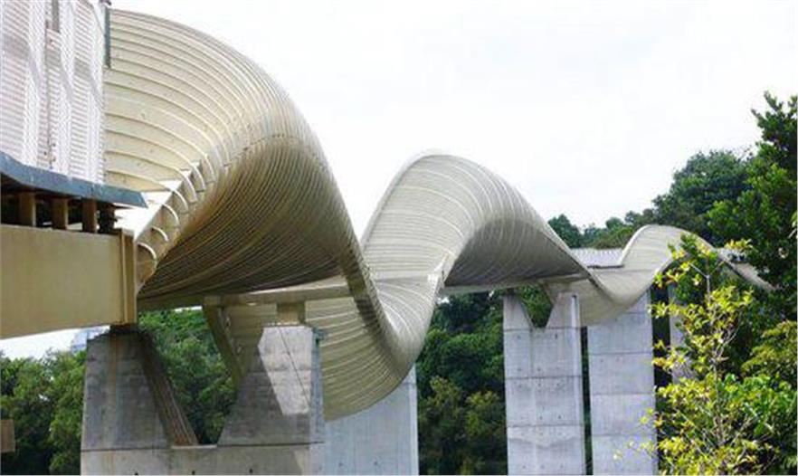 這座橋是一個(gè)工程奇跡,其獨(dú)特的建筑結(jié)構(gòu)吸引了全世界許多工程師的注意。莫比烏斯帶風(fēng)格的人行天橋架在龍王港河上,跨度為490英尺(150米),高79英尺(24米),這座橋在不同層次上有不同的路線。