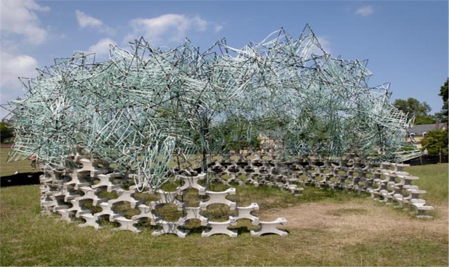 頂棚中三角形鋼筋將用作“牡蠣公寓”,那時候這些鋼筋縫隙中將會充滿了牡蠣殼。頂棚由螺紋三角形鋼筋組裝而成,之間通過塑料繩連接,從而構(gòu)成了一個類似穹頂?shù)木W(wǎng)狀結(jié)構(gòu)。位于結(jié)構(gòu)基礎(chǔ)部位的混凝土“礁石塊”以及棲息空間將會覆蓋一層“牡蠣”,這些將會投入海港以形成新的珊瑚礁。此外,為了籌備物資,亭子將會提高“十億牡蠣項目”的公眾認(rèn)知度,給市民提供參觀并了解這項技術(shù)的機(jī)會。