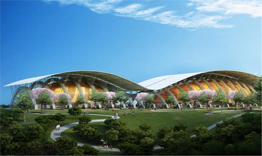 最后的設(shè)計(jì)結(jié)果是兩個(gè)蠶繭狀成一體的展館結(jié)構(gòu),上面覆蓋著一個(gè)波浪狀的鋼鐵屋頂。一陣風(fēng)就能使熱空氣在蠶繭建筑和屋頂?shù)目障吨辛镒?,而風(fēng)會(huì)有頻率的運(yùn)作,讓禮堂保持舒適的環(huán)境。設(shè)計(jì)師利用這個(gè)機(jī)會(huì)為2個(gè)禮堂增加了這個(gè)大型的屋頂,建造出一個(gè)門廳,人們能夠在活動(dòng)之前聚在一起聊天,增強(qiáng)成員之間的交流。