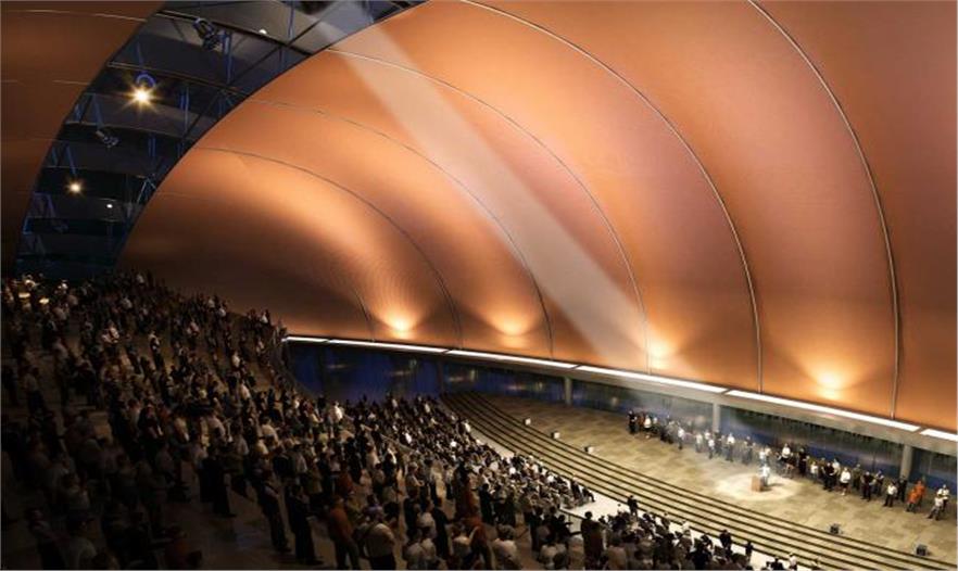 對(duì)于這個(gè)能容納1萬人和2千人禮堂的設(shè)計(jì)方案來說,該事務(wù)所的挑戰(zhàn)是去設(shè)計(jì)一個(gè)即使在炎熱的夏季沒有電的情況下也很舒適的建筑,同時(shí)要與周圍起伏的山景相融合?;趯?duì)當(dāng)?shù)仫L(fēng)場(chǎng)模式的了解以及電腦解析,設(shè)計(jì)師探索出一個(gè)幾何體,能促進(jìn)空氣的流動(dòng),維持室內(nèi)舒適的環(huán)境。同時(shí)設(shè)計(jì)師正在探索一個(gè)具有高效聲學(xué)性能的幾何體,這樣在開會(huì)的時(shí)候不用使用昂貴的高技術(shù)設(shè)備。