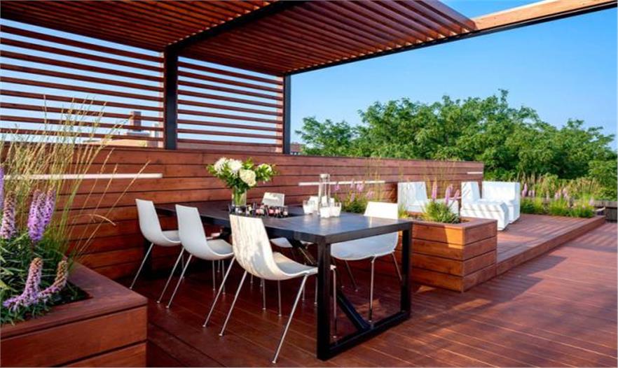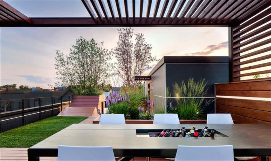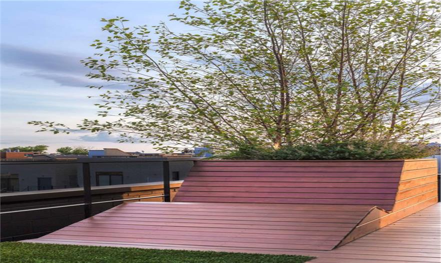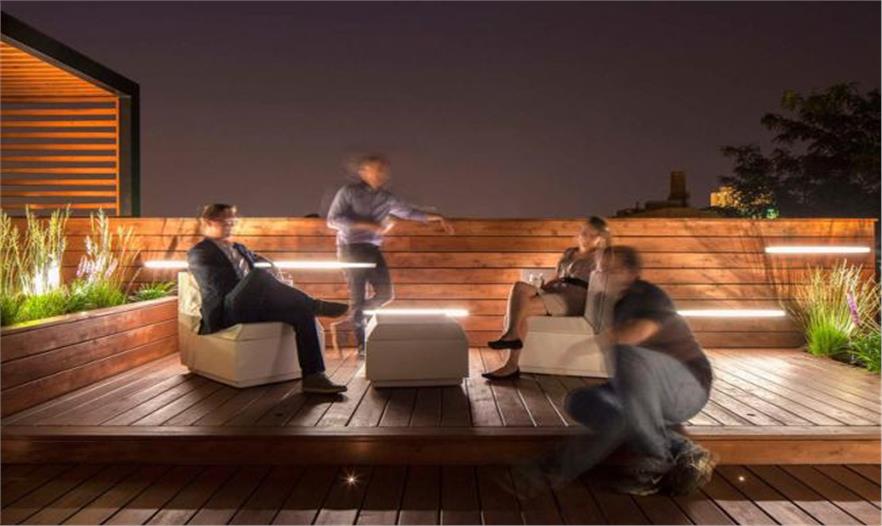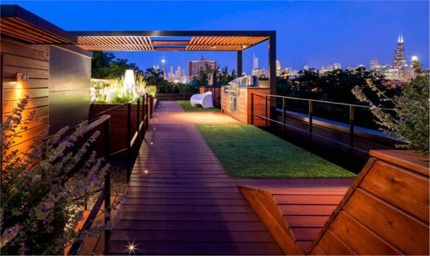 這個屋頂空間能觀賞到芝加哥的天際線,成為令人歡快的娛樂空間。這個規(guī)劃包括一個太陽甲板、廚房、用餐區(qū)、草坪和觀賞臺。