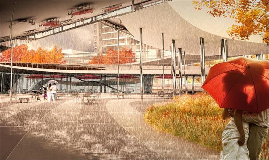 克魯茲表示,人們可以在劇場里觀看表演,劇場室外會圍上一排花盆。由于該城市想要實現水資源可持續(xù)性,這座橋就要設置一個捕獲雨水的系統,用于灌溉植物。儲水池建在橋里面,用來捕獲雨水,然后輸送給花盆。該系統和宿根的藤蔓植物一起減輕了該廣場的維護工作。在東面離橋落地的不遠處有一個帶有泳池的開放空間,夏天有幾英寸深的水或是抽干水來舉辦大型的戶外活動。冬天,泳池會變成滑冰場。