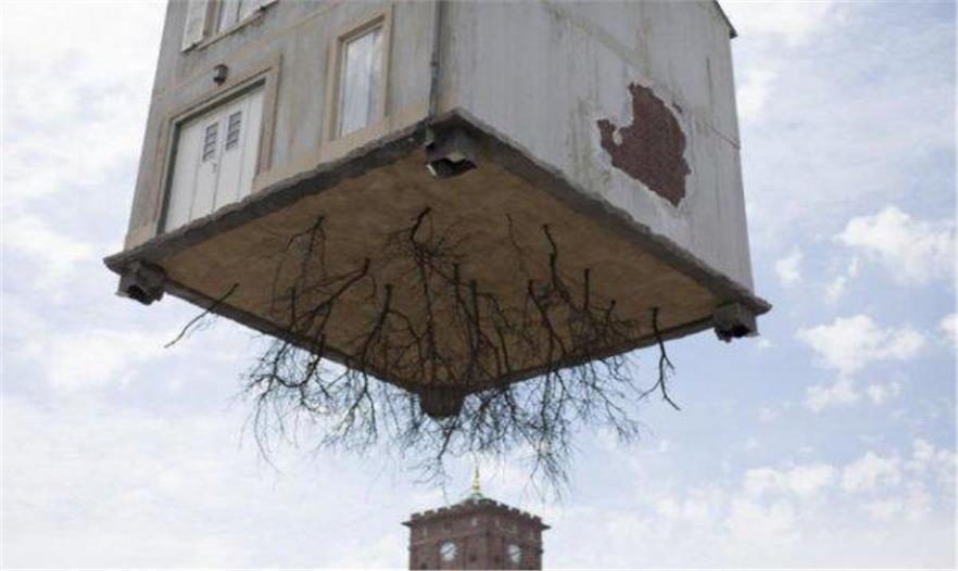 阿根廷藝術(shù)家Leandro Erlich的作品,名叫「Pulled By the Roots(連根拔起)」,由一個(gè)真實(shí)的起重機(jī),吊起一間「生根」的房子。房子做的以假亂真,類(lèi)似附近區(qū)域的建筑,底部的樹(shù)根讓房子看起來(lái)彷佛真的是從地面的一排房子里扯下來(lái)的一樣。