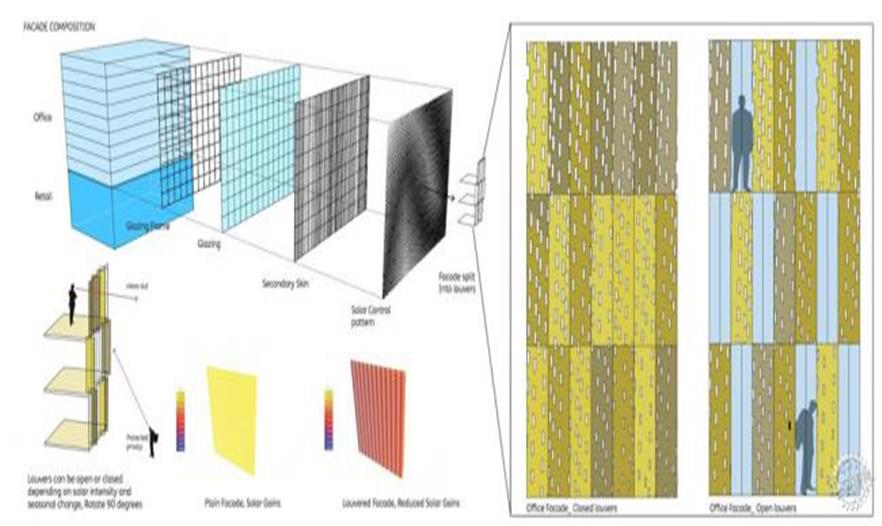該建筑三面都可以開敞,每面根據(jù)朝向有不同的太陽負荷量。由于變化的太陽負載量,每一個立面都裝載了參數(shù)化控制的百葉系統(tǒng),它可以根據(jù)天氣條件自動開合。該百葉系統(tǒng)不僅能起到隔熱作用,還能根據(jù)需要過濾日照,這樣能最大限度地減少室內人工照明和制冷系統(tǒng)的使用。