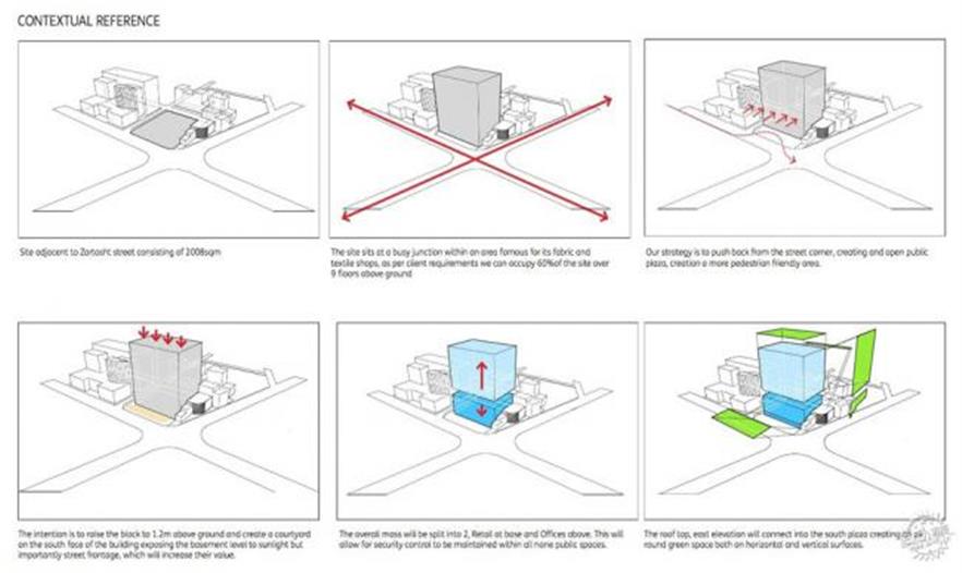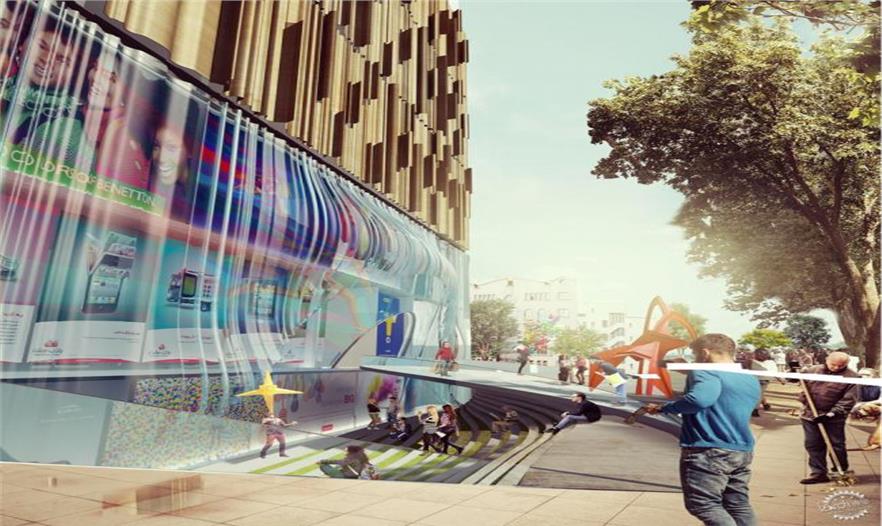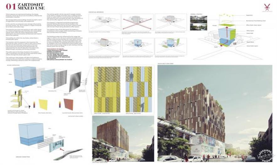 “我們這樣設計的目的在于為德黑蘭營造一個全新的零售和辦公空間。這個設計可以說很大程度上受到當?shù)啬酥烈晾视凭玫慕ㄖ幕瘹v史的影響,這使得設計的每一個部分都為能創(chuàng)造一個可持續(xù)的、創(chuàng)新的建筑做出努力”。