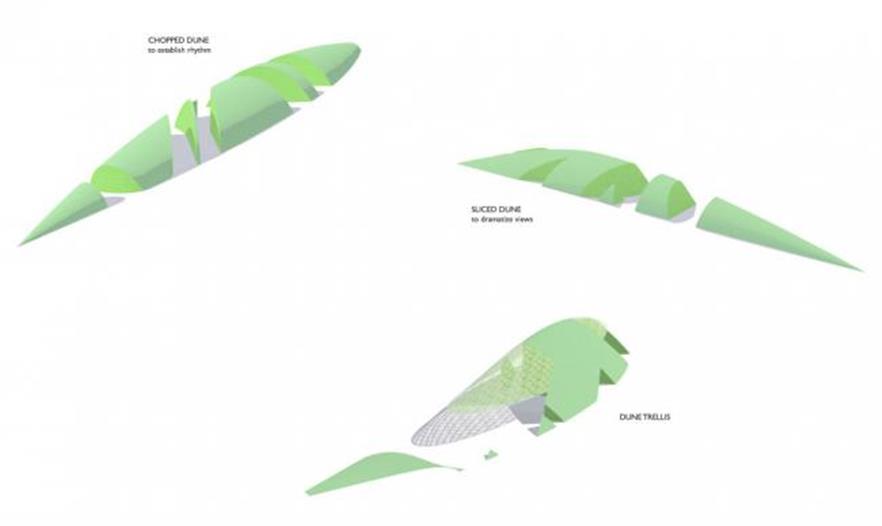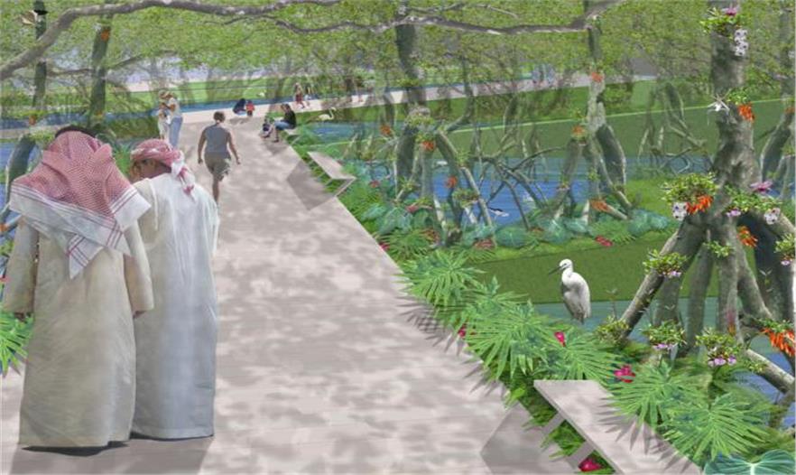 該景觀主要建在一個(gè)4層停車場臺地上,包括引人注目的線性綠植山丘,十字交叉橫穿該區(qū)域。這些綠植山丘構(gòu)成了入口庭院以及建筑之間繁茂的花園同時(shí)框架出波斯灣壯觀的景象。