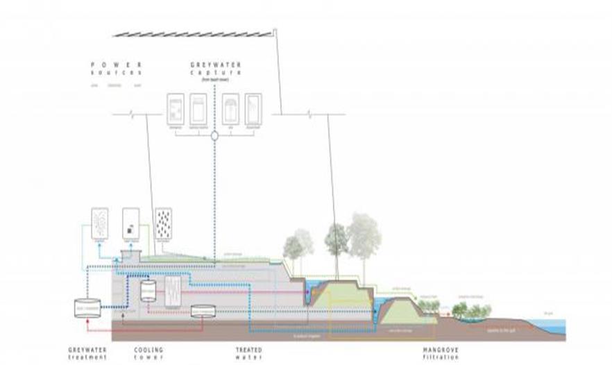 水梯和紅樹林園將停車場平臺與發(fā)展規(guī)劃一邊上的沙灘和綜合性的水池(為規(guī)劃中全面廢水回收發(fā)展中的一部分)結(jié)合起來。在停車場平臺的對立面上,帶有雕塑狀座位和植物元素的木制步行道為散步提供了更加正式的區(qū)域,坐落在零售商店、咖啡店和船塢之間。