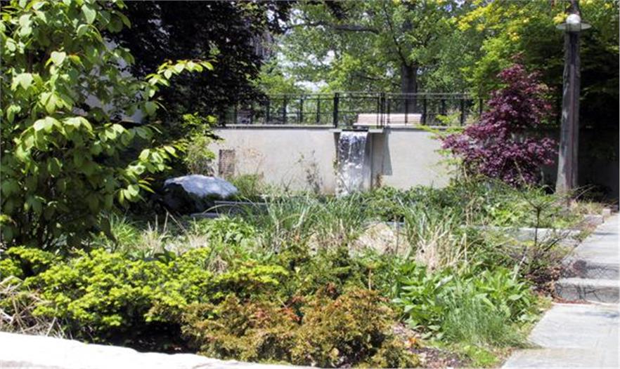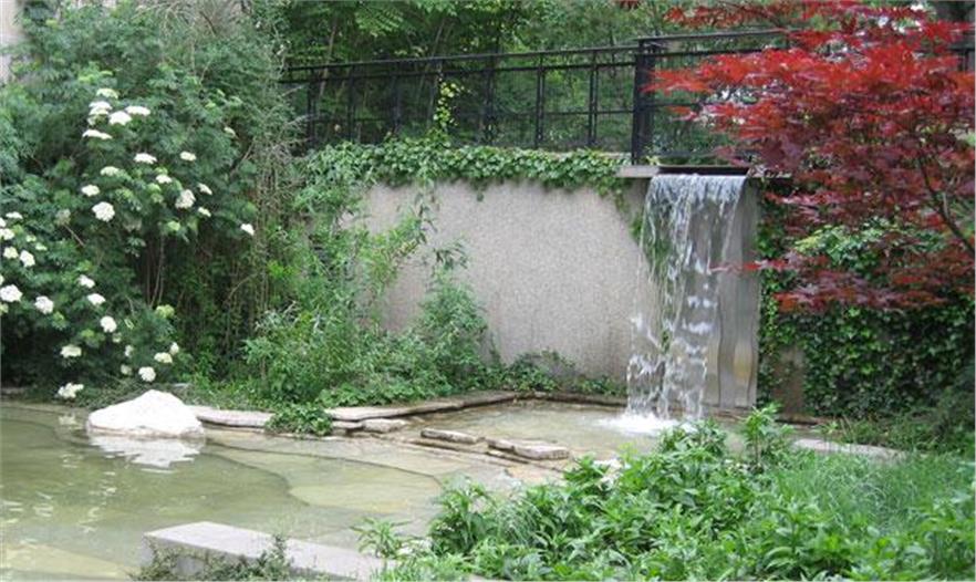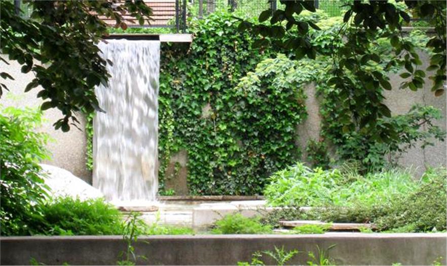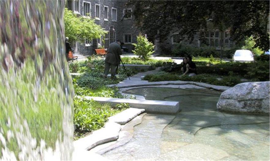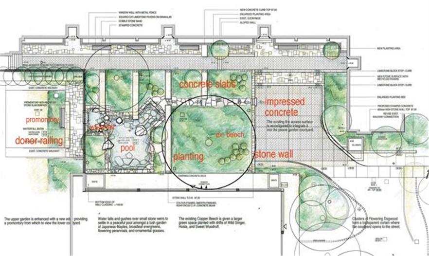 其設(shè)計(jì)理念是要建造一個(gè)非正式的花園,其中心裝置是現(xiàn)存的一個(gè)高大的紫葉山毛櫸,周邊環(huán)繞著水。PMA景觀設(shè)計(jì)事務(wù)所和維多利亞大學(xué)合作規(guī)劃這個(gè)庭院的詳細(xì)設(shè)計(jì):一個(gè)自由形態(tài)的花園,特色是宿根植物群、淺水池和瀑布。繁茂的地被植物中穿插著平滑的混凝土石板和石頭鋪砌的道路,讓游客順著道路游賞花園,不會(huì)破壞到植物。設(shè)計(jì)師將所有的硬景觀元素放到該區(qū)域的地面上,最小化對(duì)山毛櫸根部系統(tǒng)的壓力。PMA景觀設(shè)計(jì)事務(wù)所特制了一個(gè)銅欄桿,為上面凸起的部分提供了一個(gè)可以依靠的護(hù)欄,還掛有捐贈(zèng)者的牌匾。