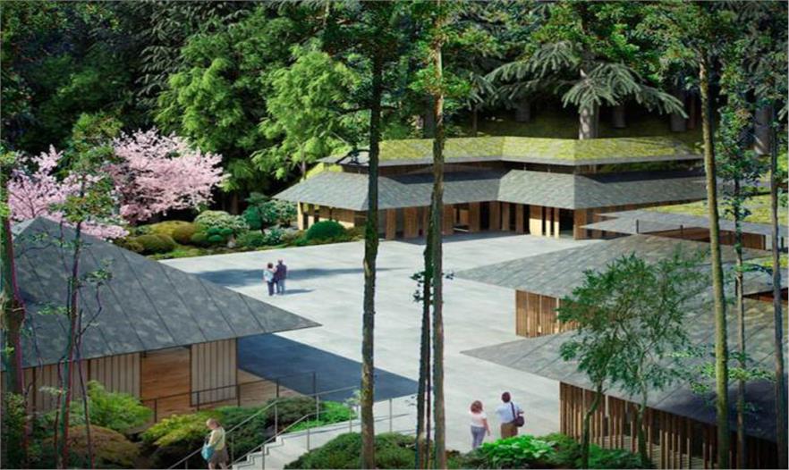 美國(guó)西海岸的波特蘭是一座多元而奇妙的城市,人口種族多樣、充滿藝術(shù)氣息和生機(jī)活力。在這里看到來自世界任何地方的文化元素你都不會(huì)感到奇怪。波特蘭西南邊的一座小山坡上有一個(gè)歷史超過 50 年的日本園林,它被視為日本本土以外最正宗的日式園林之一,也是波特蘭的城市一景。50 多年來,這座園林的游客從年均 3 萬人增長(zhǎng)到 35 萬人,為容納更多游客,這座園林啟動(dòng)了擴(kuò)建計(jì)劃。而擴(kuò)建更重要的目的是讓整個(gè)園林的景觀不被破壞,依然作為城市中的清靜之地存在。擴(kuò)建項(xiàng)目由日本設(shè)計(jì)師隈研吾主持,這也是隈研吾第一次被美國(guó)公共機(jī)構(gòu)委托設(shè)計(jì)。他要為這座日本園林新建一個(gè)“文化村”,把熱鬧的社會(huì)活動(dòng)引出園林外,使其重歸靜謐。落成的文化村將是一個(gè)建筑群,與周邊自然景觀和現(xiàn)有建筑緊密融合。