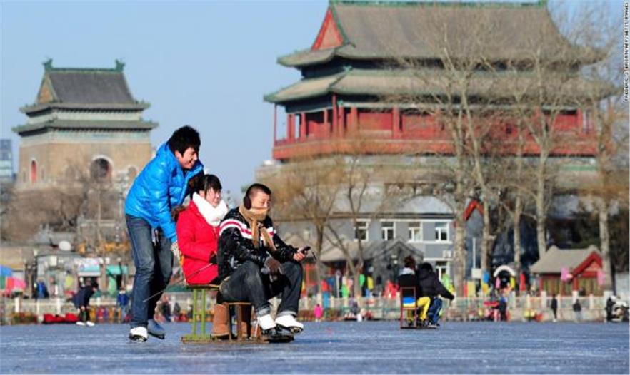 什剎海是由前海、后海和西海三部分構(gòu)成。這個戶外溜冰場周圍滿是歷史建筑,場內(nèi)還能出租冰椅和冰上自行車。