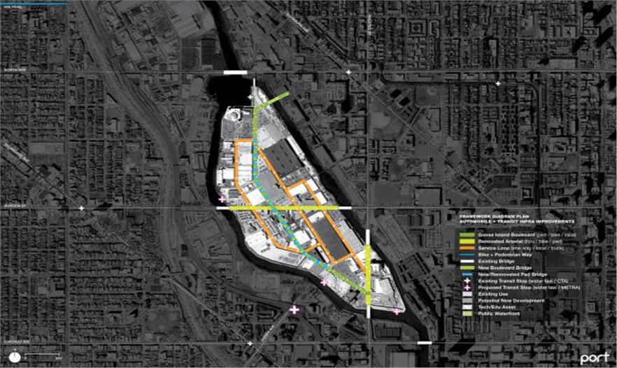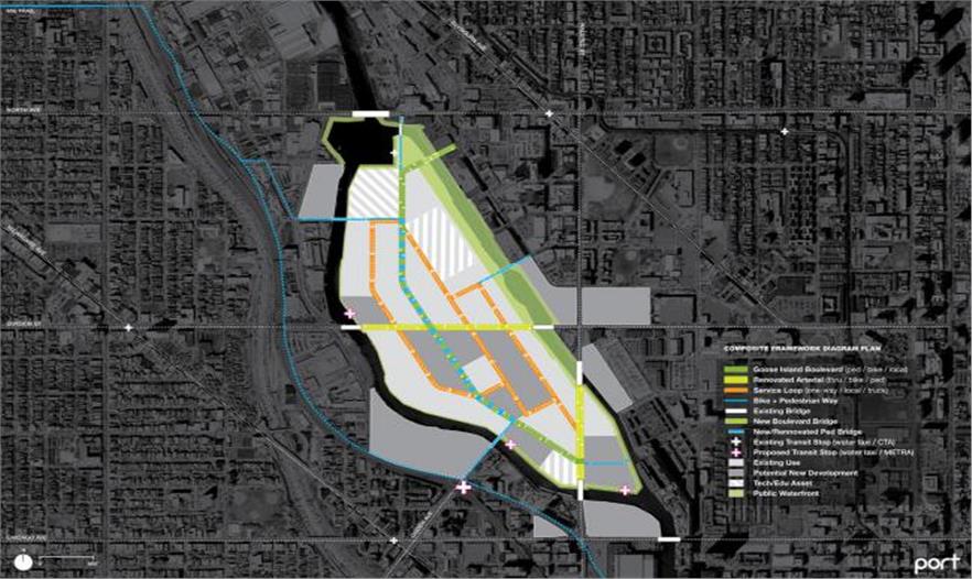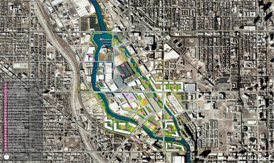 為了扭轉(zhuǎn)芝加哥鵝島這個(gè)小而獨(dú)特的地區(qū)的命運(yùn) ,房地產(chǎn)開(kāi)發(fā)公司 R2 公司和城市規(guī)劃組織 PORT Urbanism 聯(lián)手設(shè)計(jì)了一個(gè)復(fù)活鵝島方案。這個(gè)人工島有著悠久的制造業(yè)歷史,但是缺乏許多其他芝加哥地區(qū)的收入流。所以開(kāi)發(fā)團(tuán)隊(duì)希望2025年之前改善這種條件,使它發(fā)展成可持續(xù)的、高科技社區(qū),使其與芝加哥的城市化連接起來(lái)。