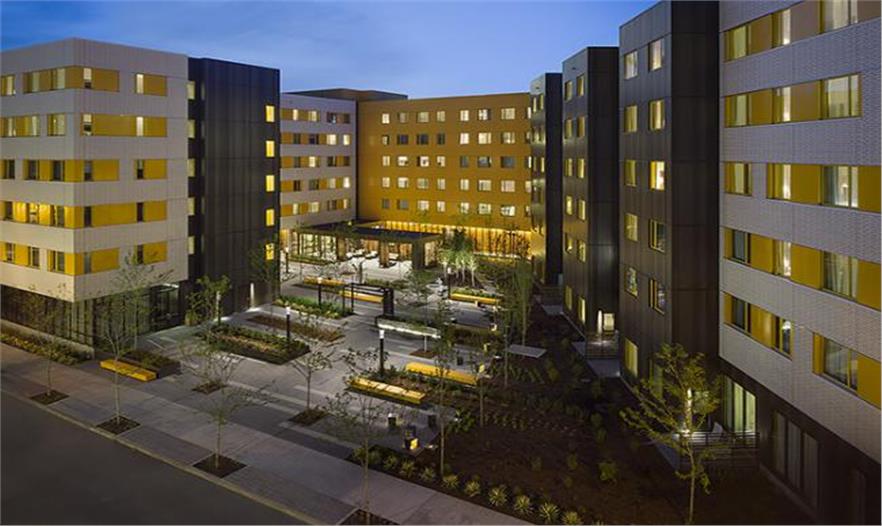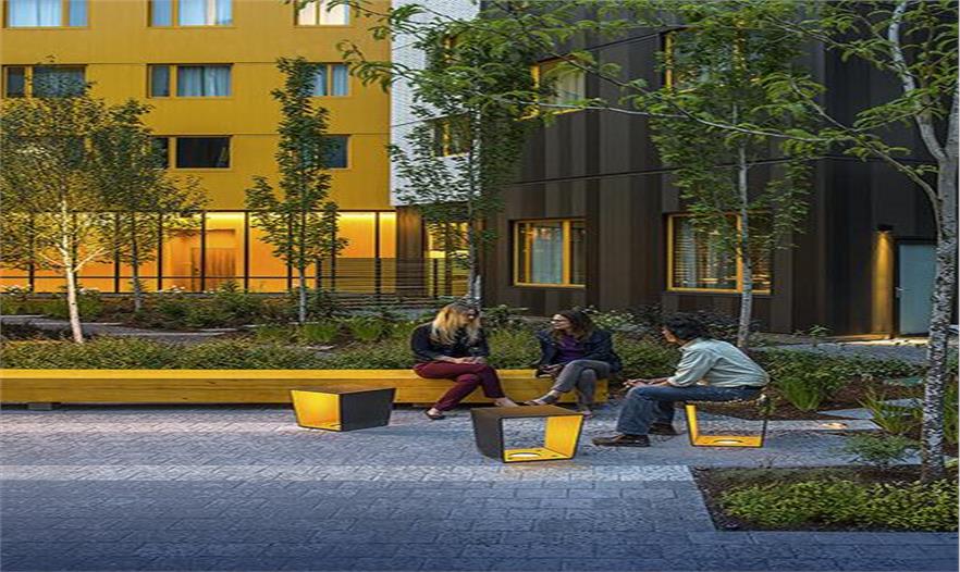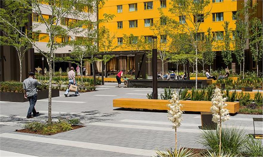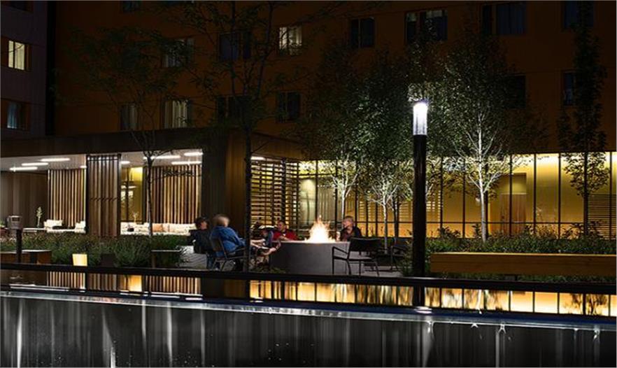 Pearl Marriott酒店建造了一個(gè)城市綠洲,酒店的顧客可以在此放松、舉辦社交聚會(huì)和公共活動(dòng)。當(dāng)游客從遠(yuǎn)處走來時(shí)就能看到這個(gè)綠洲的景色:繁茂的植被以及顯眼的座位。人們蜿蜒地穿過花園空間,會(huì)途經(jīng)水景、火爐和大型的原木長(zhǎng)凳。小型的鐵制座位凳散布在整個(gè)空間里,方便顧客休息,同時(shí)它們晚上還會(huì)發(fā)光。植物配置構(gòu)建了全年的結(jié)構(gòu)和顏色,增強(qiáng)了私人聚集區(qū)域的氛圍,并為一層的會(huì)客室提供了屏障。大型的皂莢樹以網(wǎng)格的形式種植,夏季呈現(xiàn)出斑駁的陰影,增添了無限的趣味。