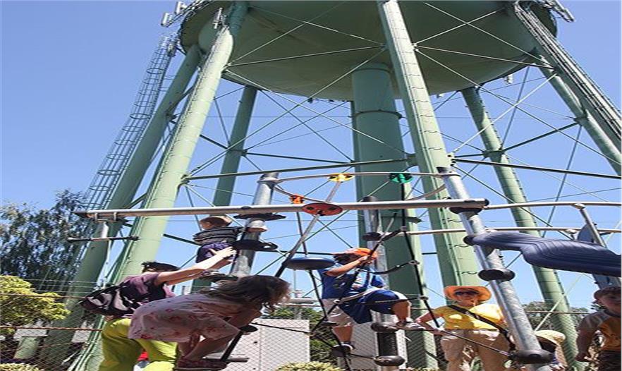 游客一眼望去就能看到該公園里大型的冠木樹和一個(gè)老舊的消防站(現(xiàn)在改造成一個(gè)文化藝術(shù)中心)。其連接元素是兩條主軸線步行道,蜿蜒曲折地穿行于百年老樹中。這些通道會到達(dá)一個(gè)游樂區(qū),旁邊是一個(gè)大型的水塔、小型的聚會空間以及一個(gè)用于戶外表演的圓形露天劇場。