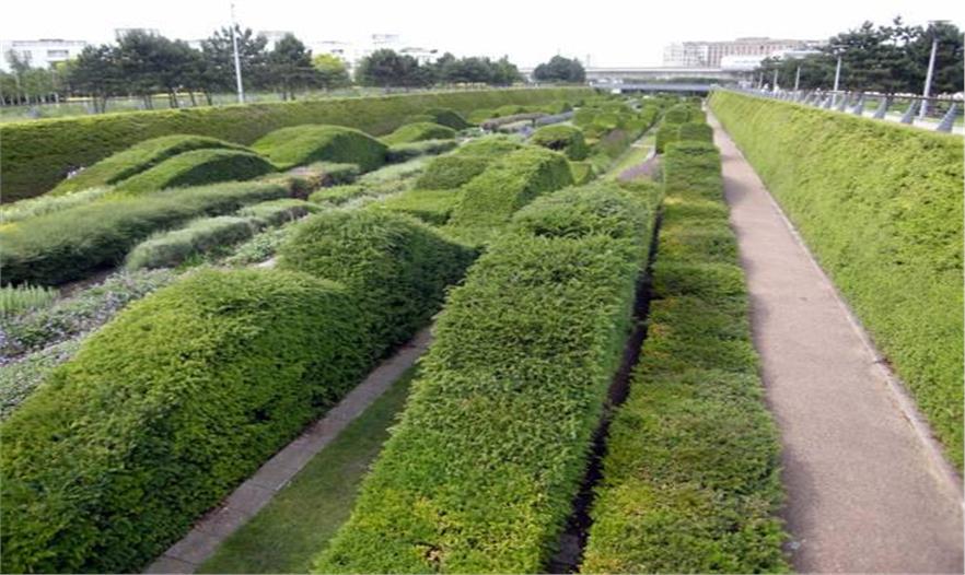 泰晤士河壩公園以前是用于化學(xué)和染色工藝的工業(yè)區(qū),嚴重污染了土壤及地下水?,F(xiàn)在不同了,波浪式的樹籬展示該地區(qū)港區(qū)的歷史。公園有強烈對比的斜線,分割了前往河流方向的矩形花園。該公園不僅吸引游客,還歡迎公園周邊的居民來游玩,因為它有運動場、噴泉廣場以及籃球場。公園里充滿強烈的歷史主題氣息,主要是因為選擇的植物以及靠近甲板的地理位置。