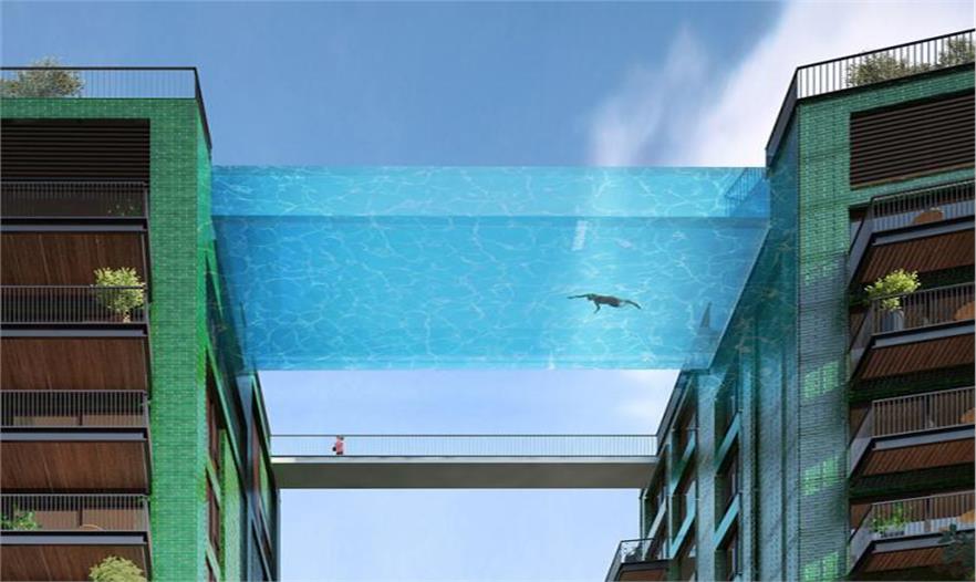 這個(gè)開發(fā)區(qū)位于倫敦泰晤士河附近,將會有一個(gè)透明的游泳池,橫跨在2個(gè)新的10層公寓建筑樓之間。