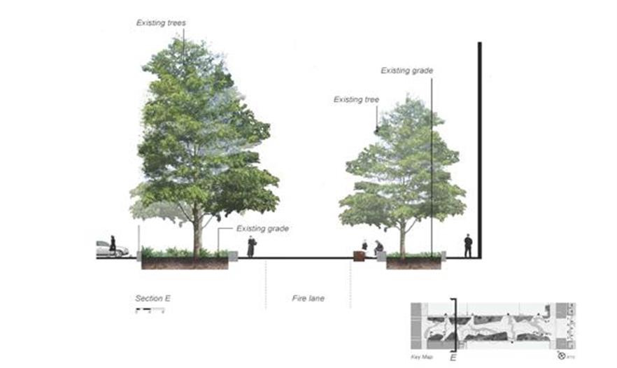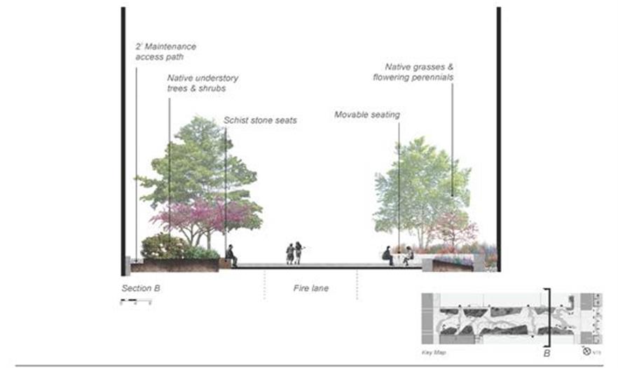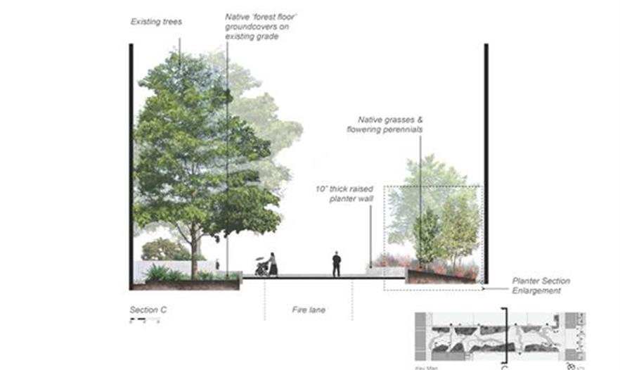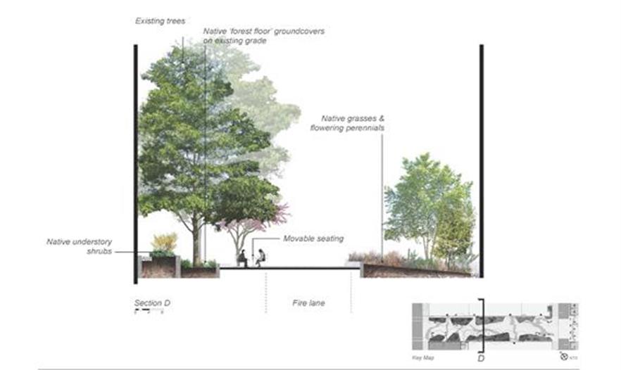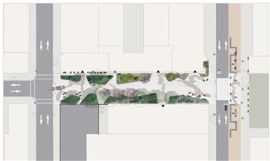 馬修斯•尼爾森(Mathews Nielsen)正在設計西185街的街區(qū)部分,這是紐約交通部把臨時的街道封閉區(qū)改造成固定的公共廣場倡議活動的一部分。這個廣場位于葉史瓦大學校園、華盛頓高地和社區(qū)的中心,它必須要均衡這些不同的群體。馬修斯•尼爾森的方案是不管從平面圖還是立面圖上看都是起伏狀的植物群,在校園建筑內仔細校正來設置窗戶和活動。設計師會保護現(xiàn)存的樹木,增加新樹木來提供陰涼,尤其是在北立面沿線。