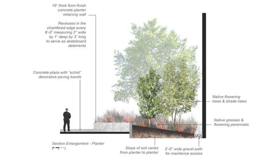 受華盛頓高地地質結構的啟發(fā),在廣場的每一端都有當?shù)氐钠閹r座位石塊,構成花壇的墻壁和人們的座位以及小型的群體座位,它會成為社區(qū)居民最休閑放松的區(qū)域。該廣場的中心內還有另外可移動的桌椅。其鋪路材料也會想起地質學,因為插入受冰層啟發(fā)研制的奇特的可滲透混凝土,還可用來收集街道沿線的雨水。這個中心會對應急車輛開放,保護地下的公共事業(yè)管線。