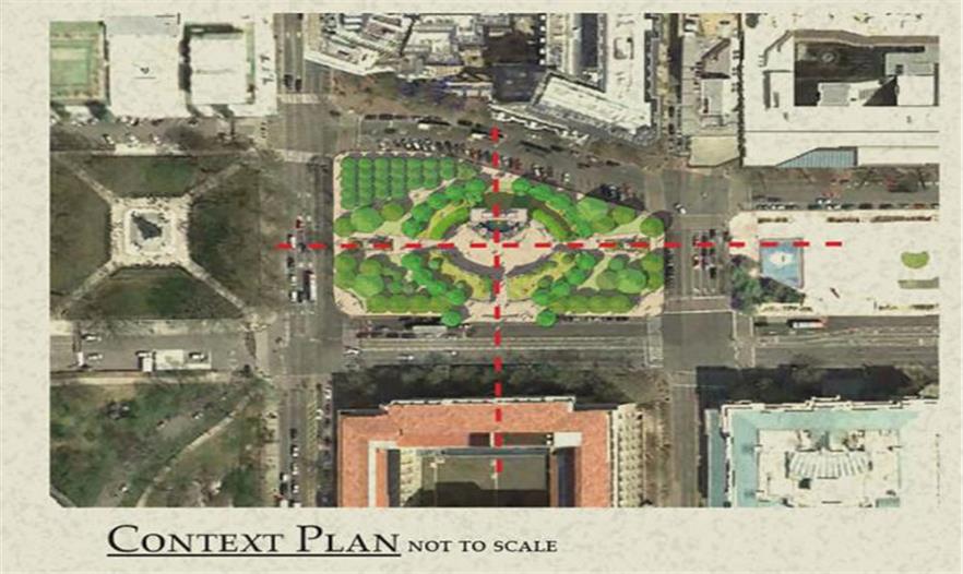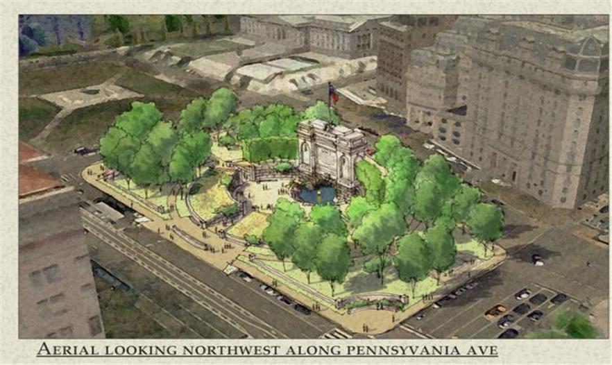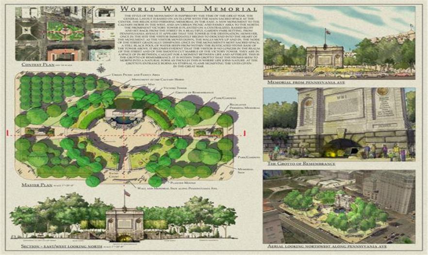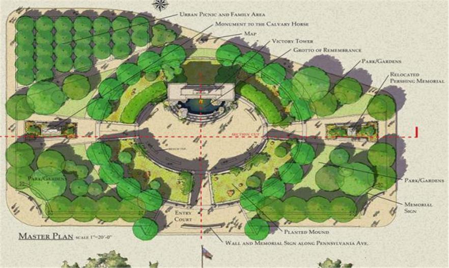 其中最顯要的建筑勝利塔則位于其顯要的位置,相當具有氣勢,周邊則是一個漂亮的花園。沿著賓夕法尼亞大道,這里則是路的盡頭。然而,只要游客到了這里,都會自然而然的往紀念公園的中心走去,街上的噪音逐漸消散。紀念碑是最神圣的空間,黑色的池內的水從石間滲透出來,“灌溉”著池子。