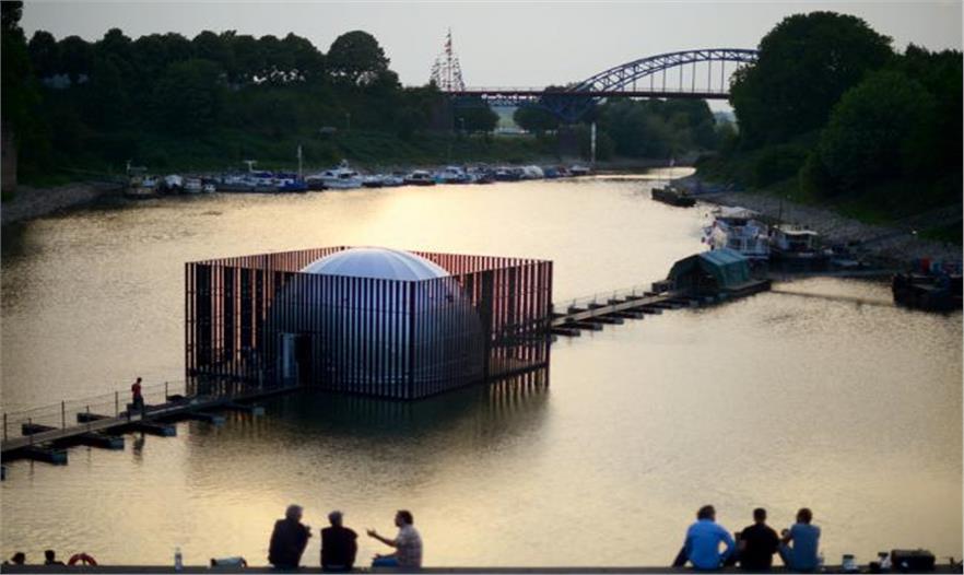 杜伊斯堡-魯爾,這里原來是一處鐵路港口,連接著萊茵河、魯爾河和海恩萊茵運(yùn)河,為了迎接一年一度的魯爾藝術(shù)節(jié),robyn backen, andre dekker, graham eatough, nigel helyer以及jennifer turpin五位藝術(shù)家在這里設(shè)計(jì)建造了“nomanslanding”裝置。這是一座可以移動(dòng)的橋,橋的中間是兩個(gè)相似的半圓形結(jié)構(gòu),整個(gè)橋面可以自由地延伸和收縮。當(dāng)游客們沿著橋面走向?qū)Π兜臅r(shí)候,他們首先會(huì)到達(dá)中央的球形裝置,球形裝置周圍被方形的木板包圍著。