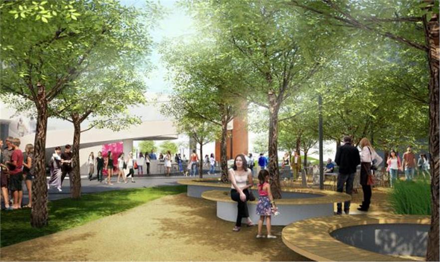 環(huán)繞廣場周邊有三處綠地:小樹林內(nèi)廣場入口,小樹林里圓形劇場,小樹林中的社團野餐區(qū)。所有的區(qū)域中都特意在有座椅和人行道的地方提供遮陰庇護。